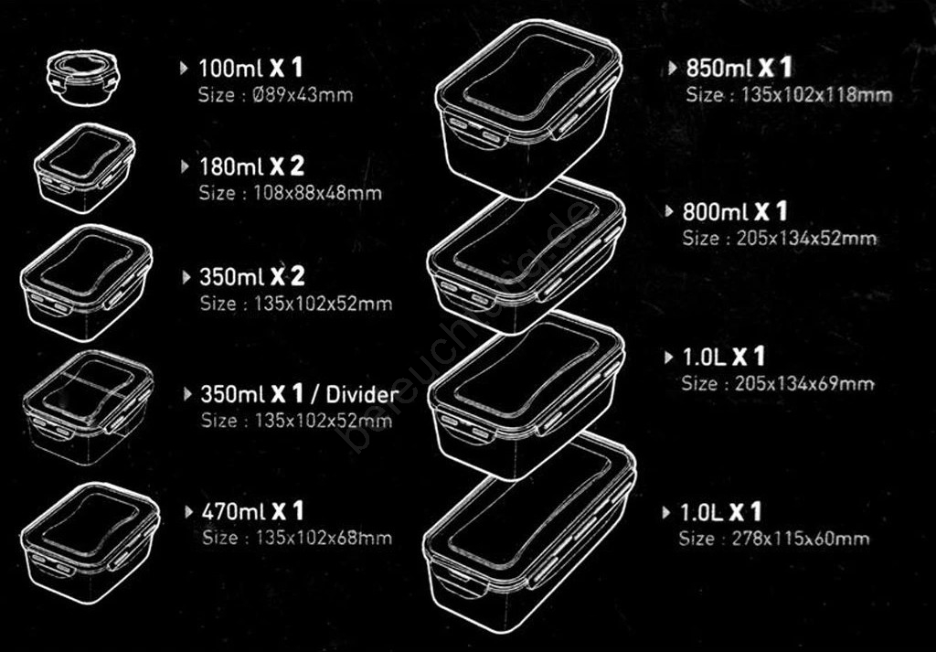 • Die Behälter sind mikrowellengeeignet, gefriergeeignet und spülmaschinenfest.