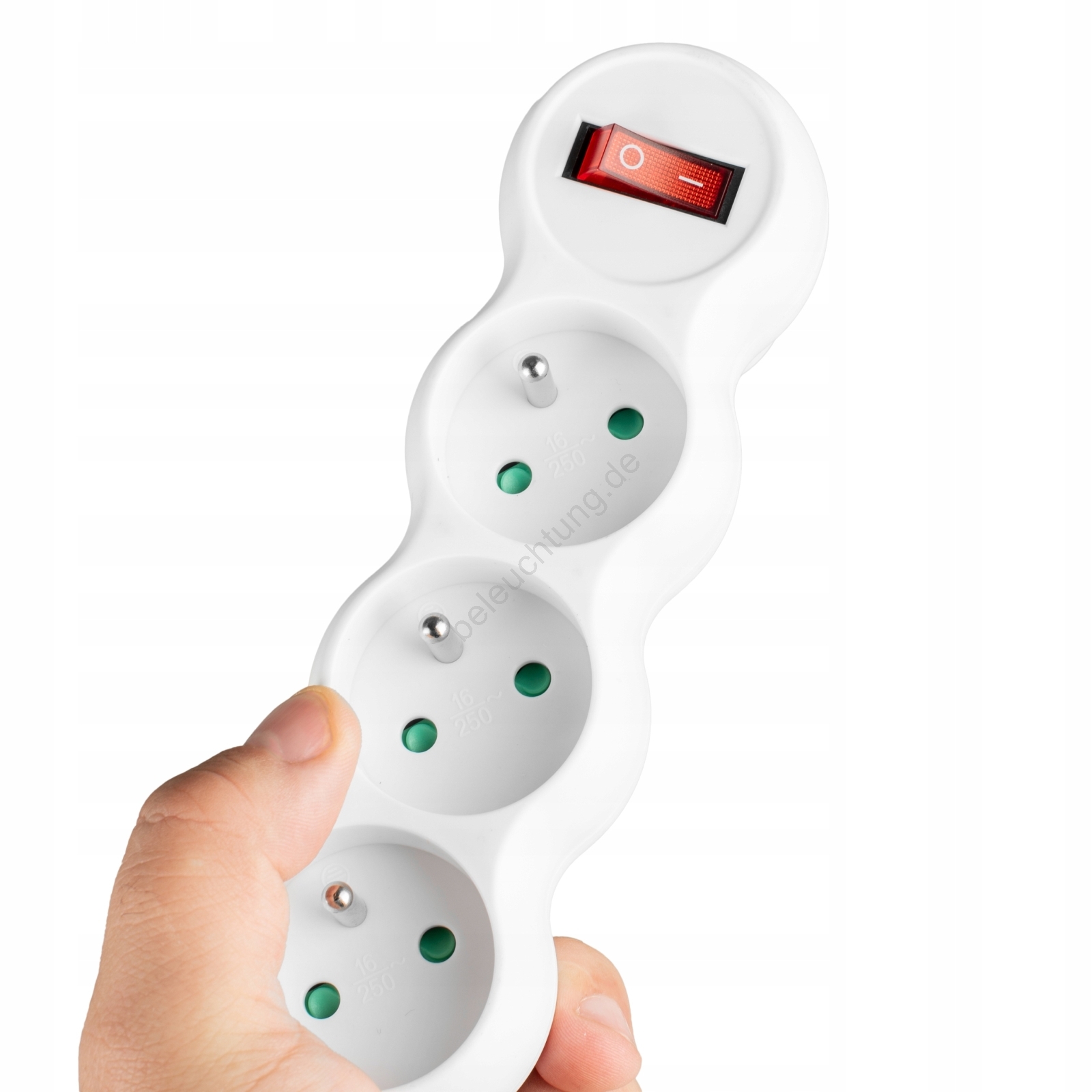 • Steckdosenverteiler mit 3 geerdeten Schutzkontakt‑Steckdosen und verlängertem Gehäuse mit Bodenplatte.