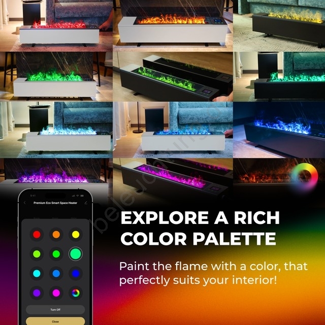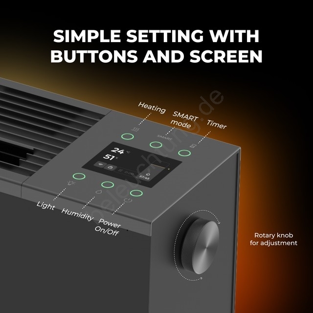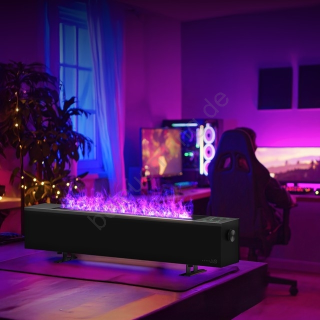 • Das Gerät lässt sich per Smart-App über WLAN steuern; Timer, Heizstufen und Effektfarbe sind einstellbar.