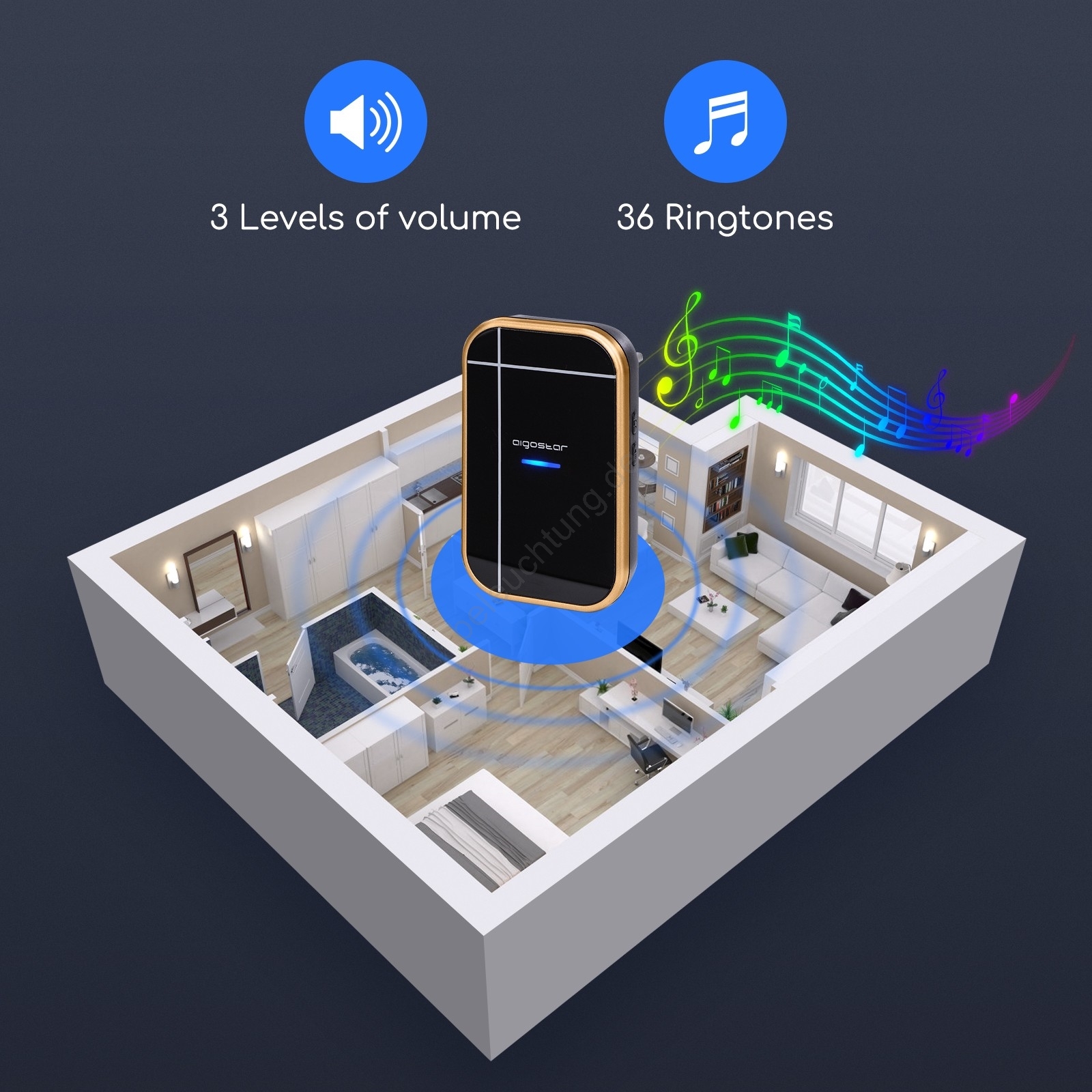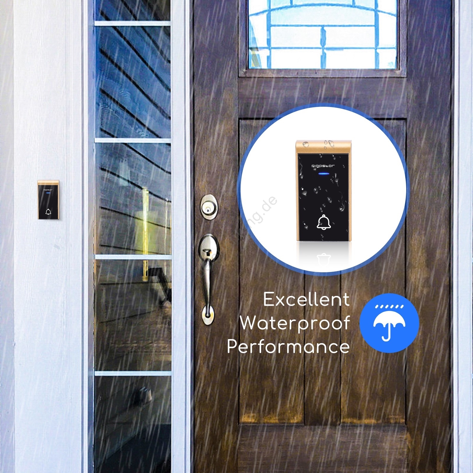 • Drahtlose Türklingel mit einer Reichweite von 150 m.