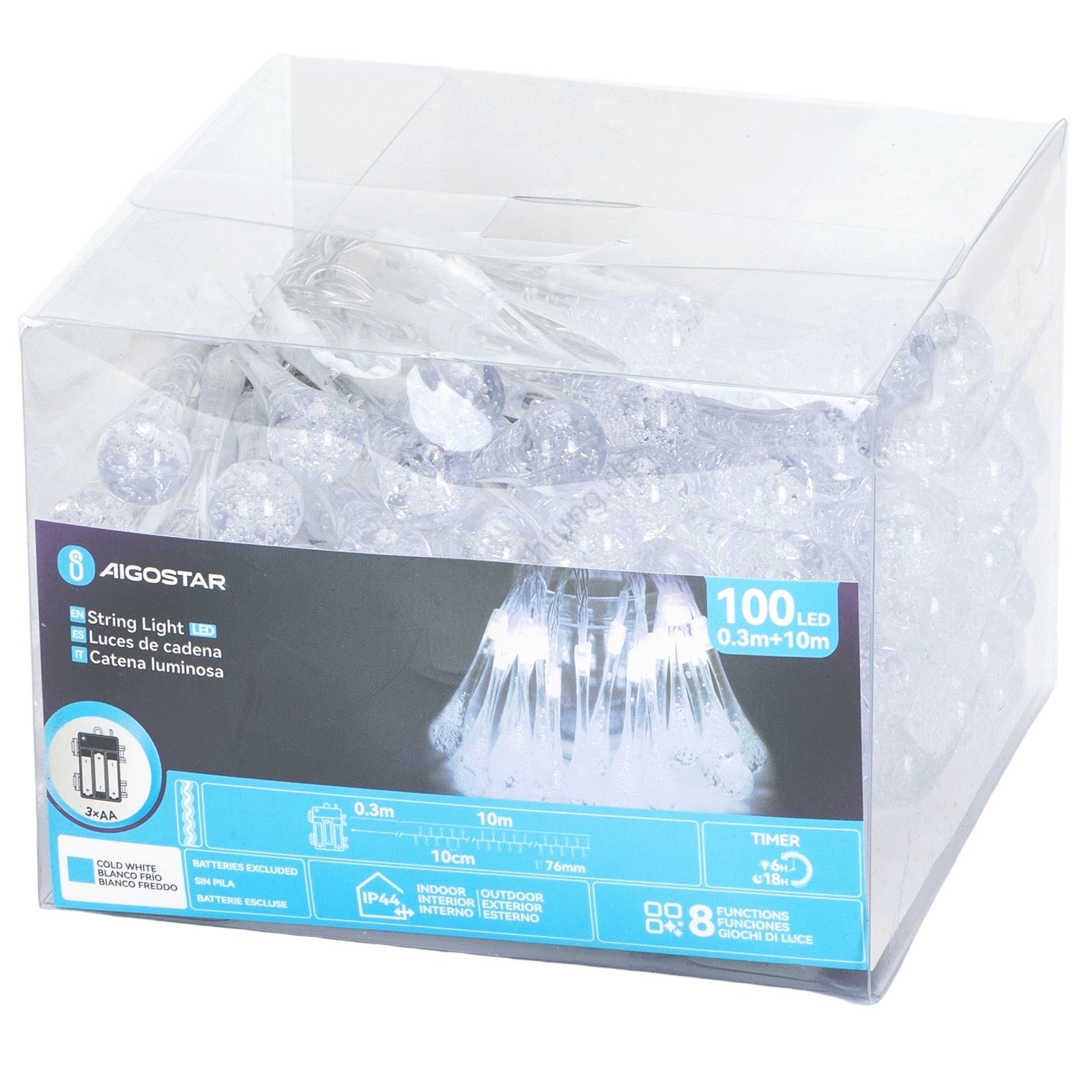Aigostar - LED-Außen-Weihnachts-Lichterkette, 100 LEDs, 8 Funktionen, 3×AA-Batterien, 10 m, IP44, kaltweiß, tropfenförmige LEDs