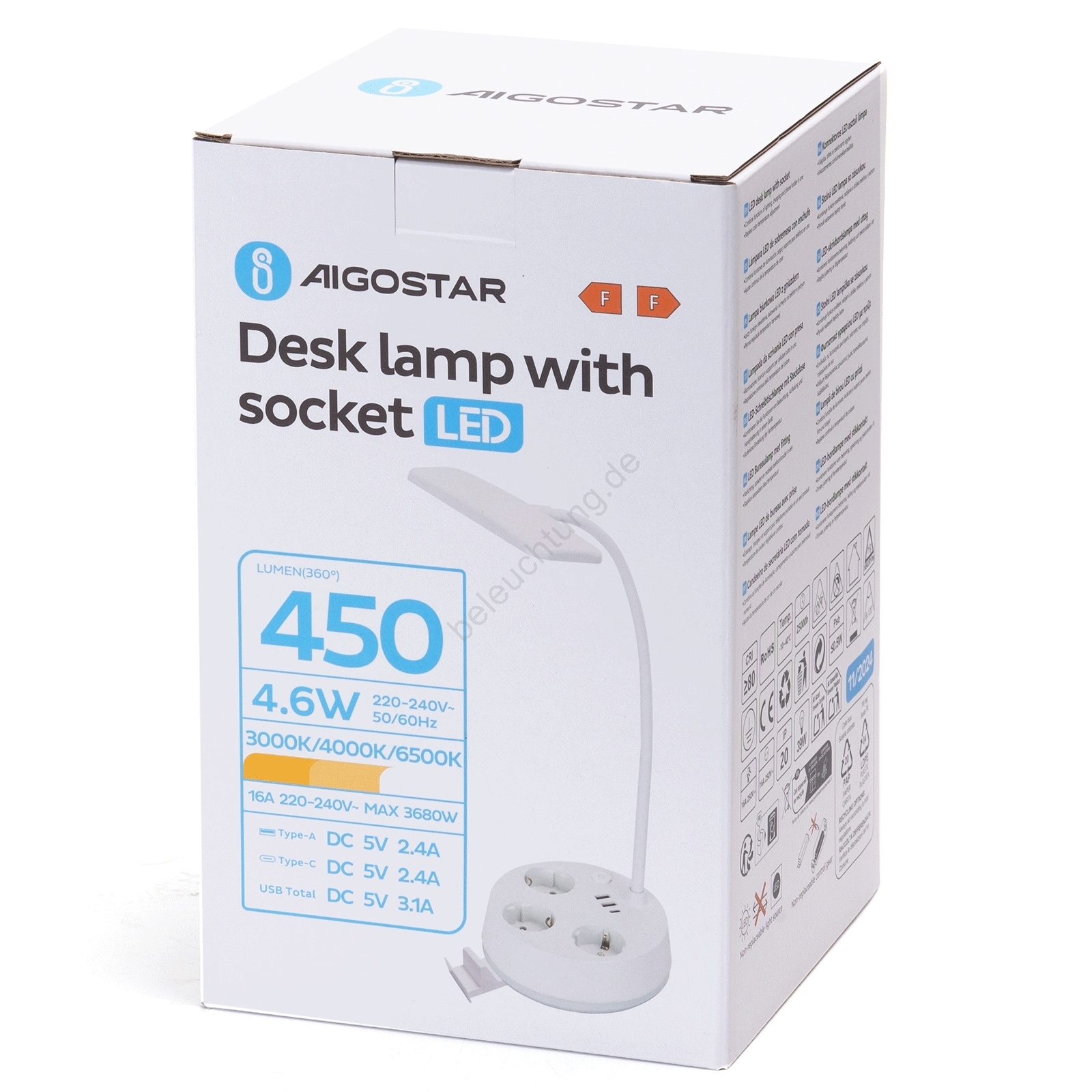 Aigostar - dimmbare LED-Tischlampe mit Steckdosen und USB-Anschlüssen LED/4,6W/230V 3000/4000/6500K weiß