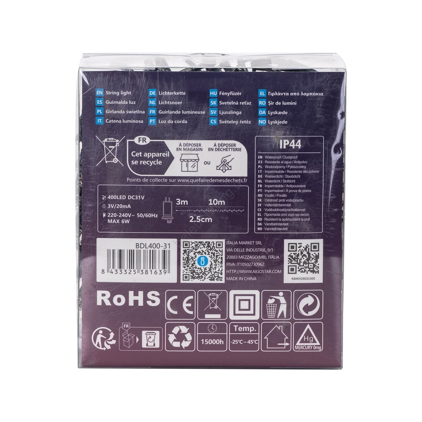 • Aigostar - LED-Lichterkette für den Außenbereich 400 LEDs / 8 Funktionen 13m IP44 kaltweiß