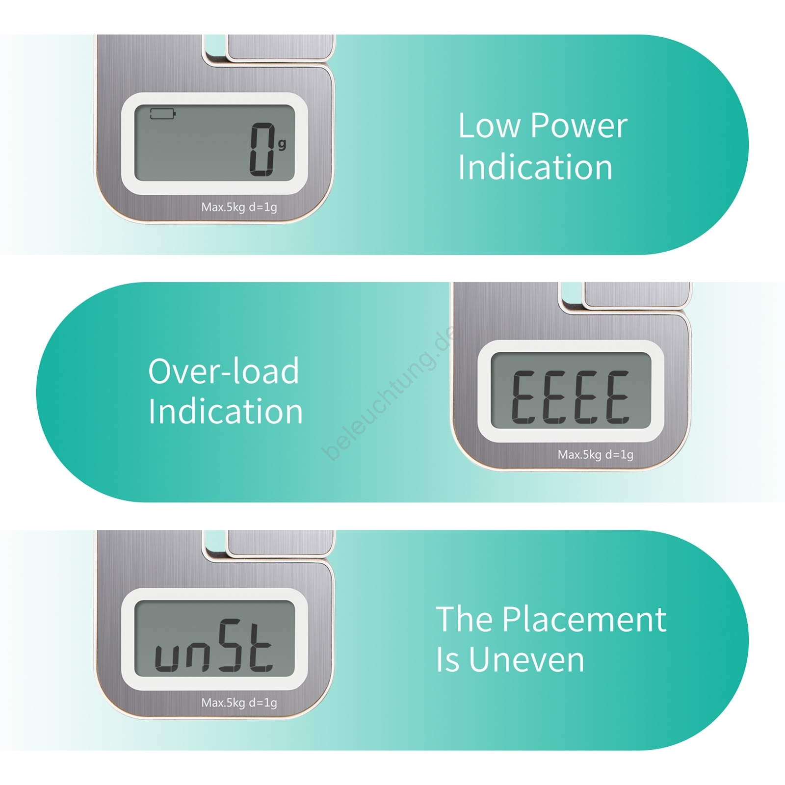 • Die Waage verfügt über eine automatische Abschaltung, eine Überlast- und Instabilitätsanzeige, eine Batteriewarnung sowie rutschfeste Füße.
