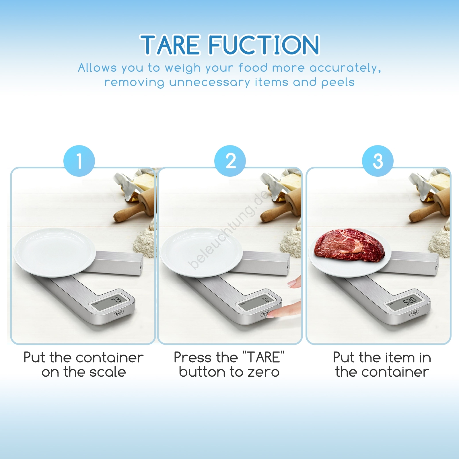 • Das Design der Waage ermöglicht es, Lebensmittel direkt auf der Waagschale oder einem Teller präzise zu wiegen, genau wie Sie es benötigen.
