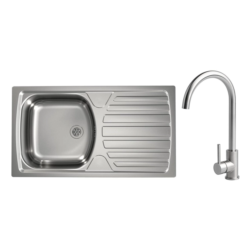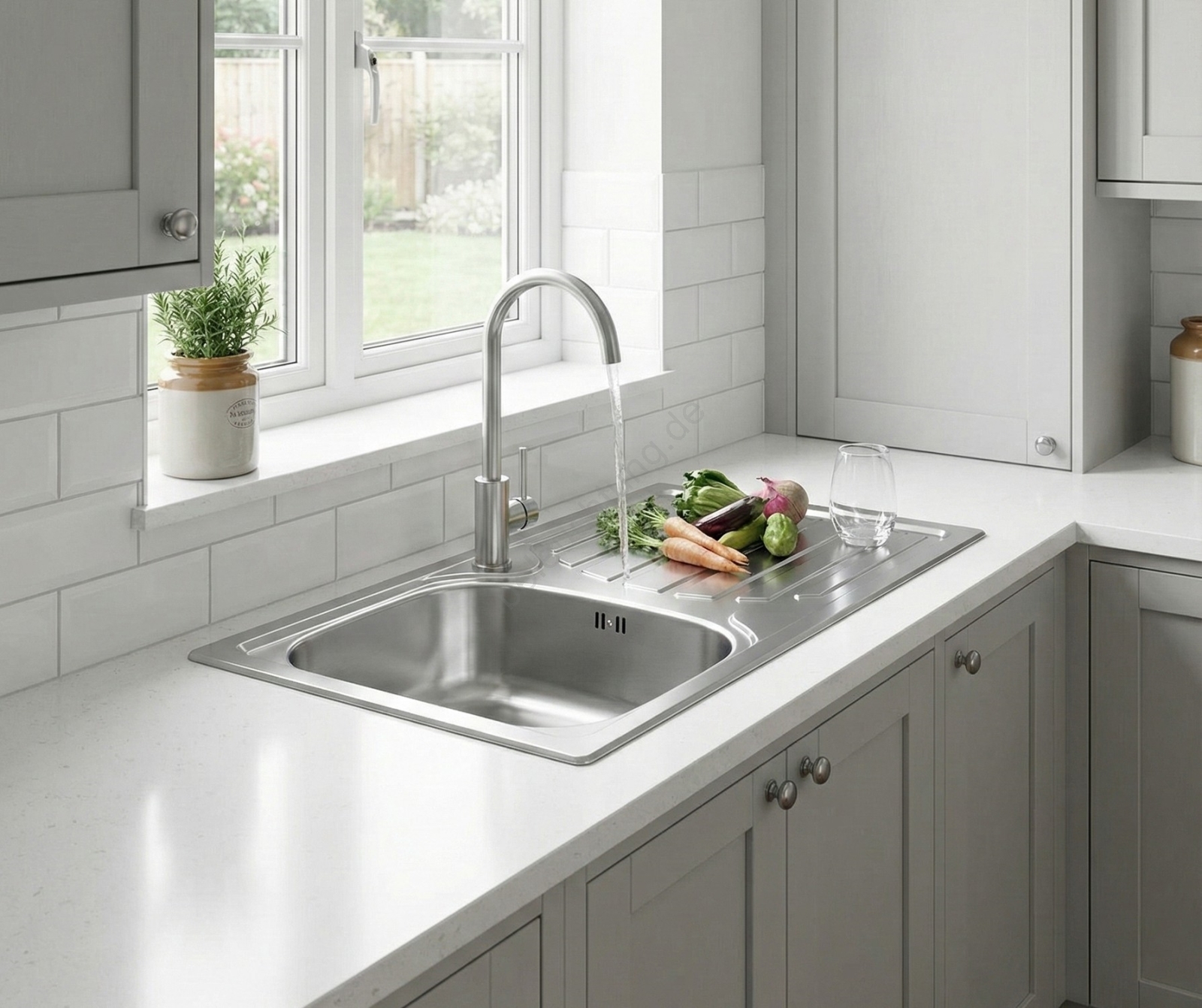 • Edelstahl-Küchenspüle im klassischen Design inklusive praktischer Küchenarmatur.