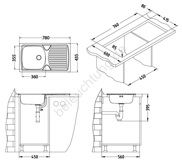 • Inhalt der Verpackung: Edelstahlspüle, Befestigungen und Dichtungen, Ablauf 1 1/2", Siphon mit Anschluss für Geschirrspüler, Stopfen, Spültischarmatur, Anschlussschläuche, Montagepaket.