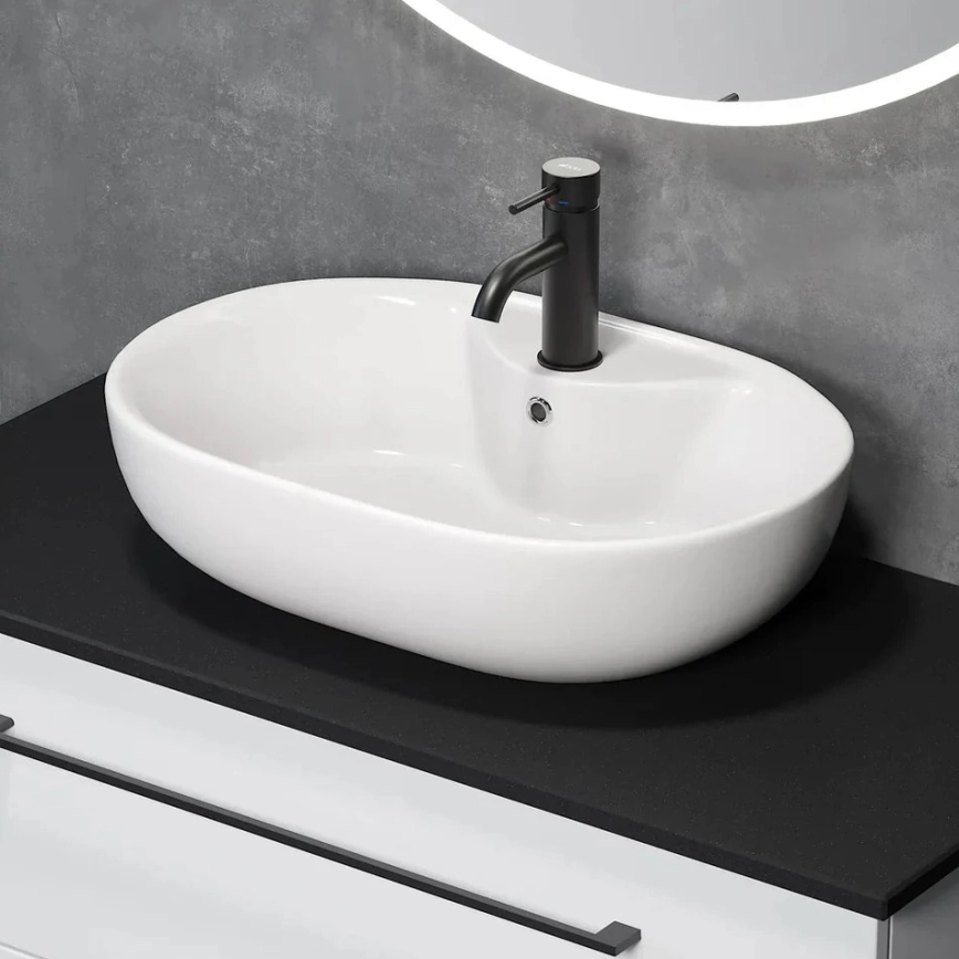 • Das Waschbecken ist für die Aufsatzmontage auf einer Waschtischplatte vorgesehen, was flexible Platzierung und die Kombination mit verschiedenen Waschtischtypen ermöglicht.