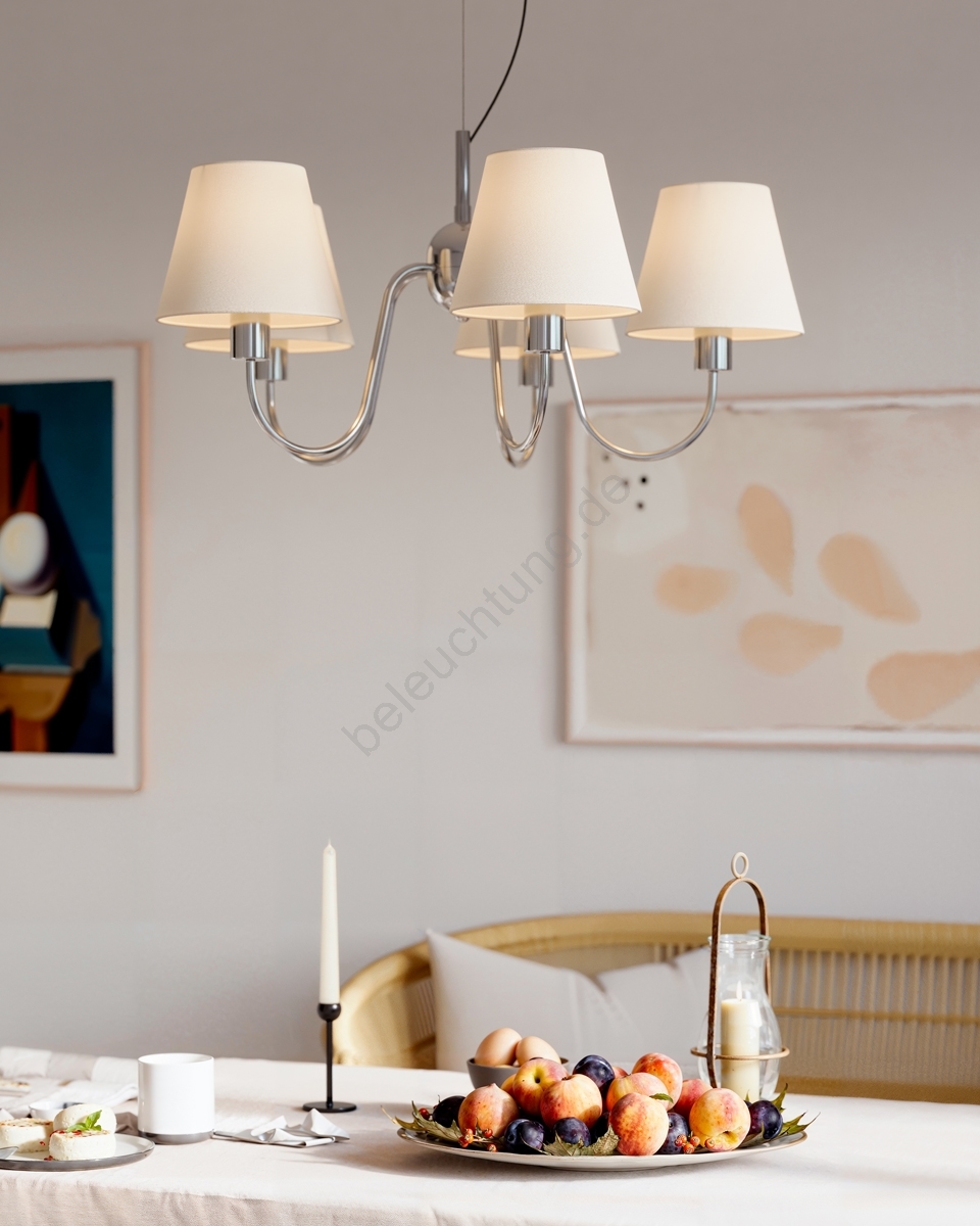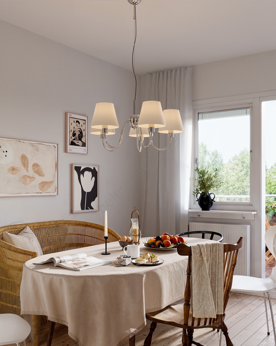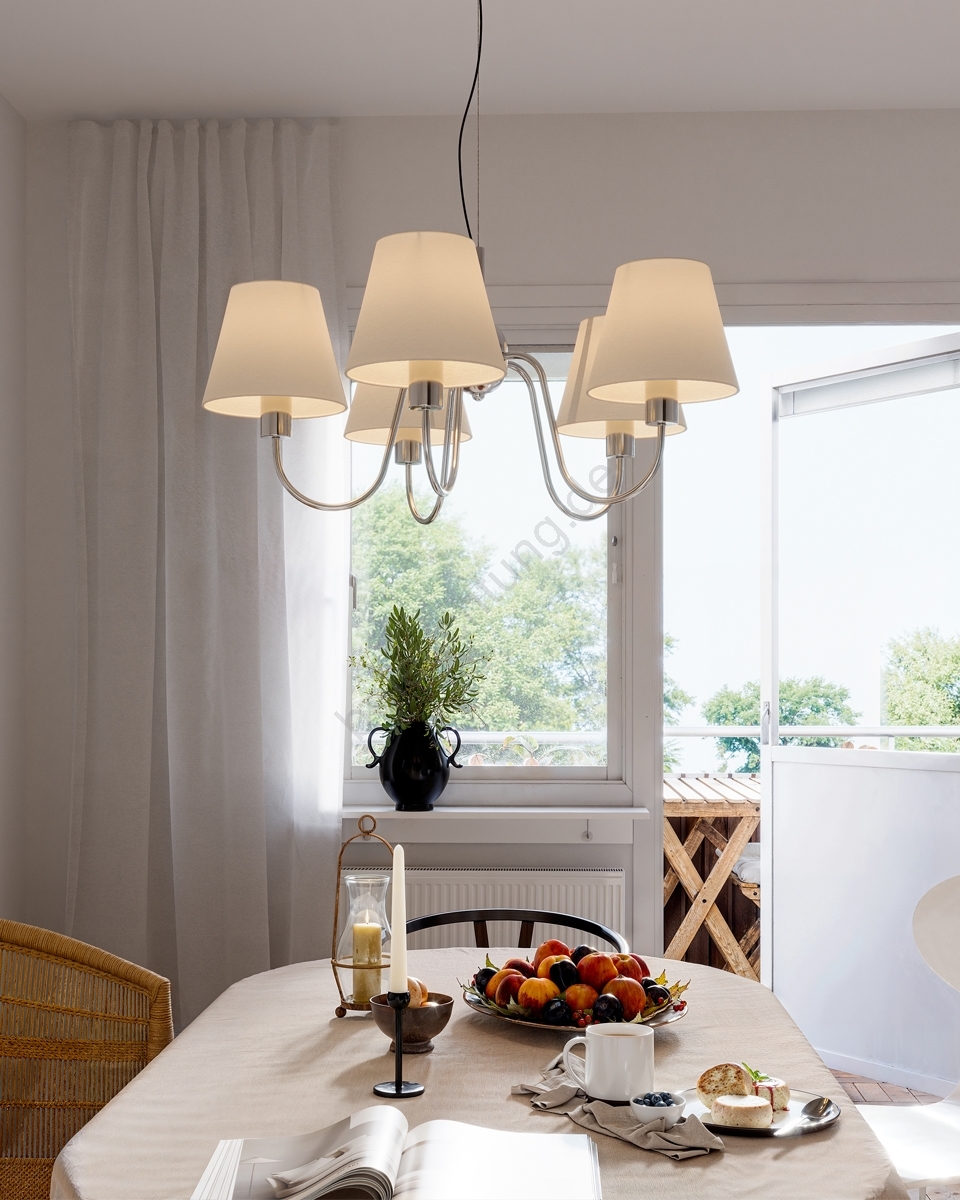 ByRydens - Hängeleuchte an Stahlseil LYNF 5xE14/8W/230V glänzender Chrom/Weiß zeichnet sich durch schönes und funktionales Design aus. Eine Glühbirne mit E14 Sockel ist für die Leuchte geeignet. Hier, können Sie andere Glühlampen zu vorteilhaften Preisen kaufen. Sie erhalten eine attraktive Ergänzung für Ihr Zuhause.