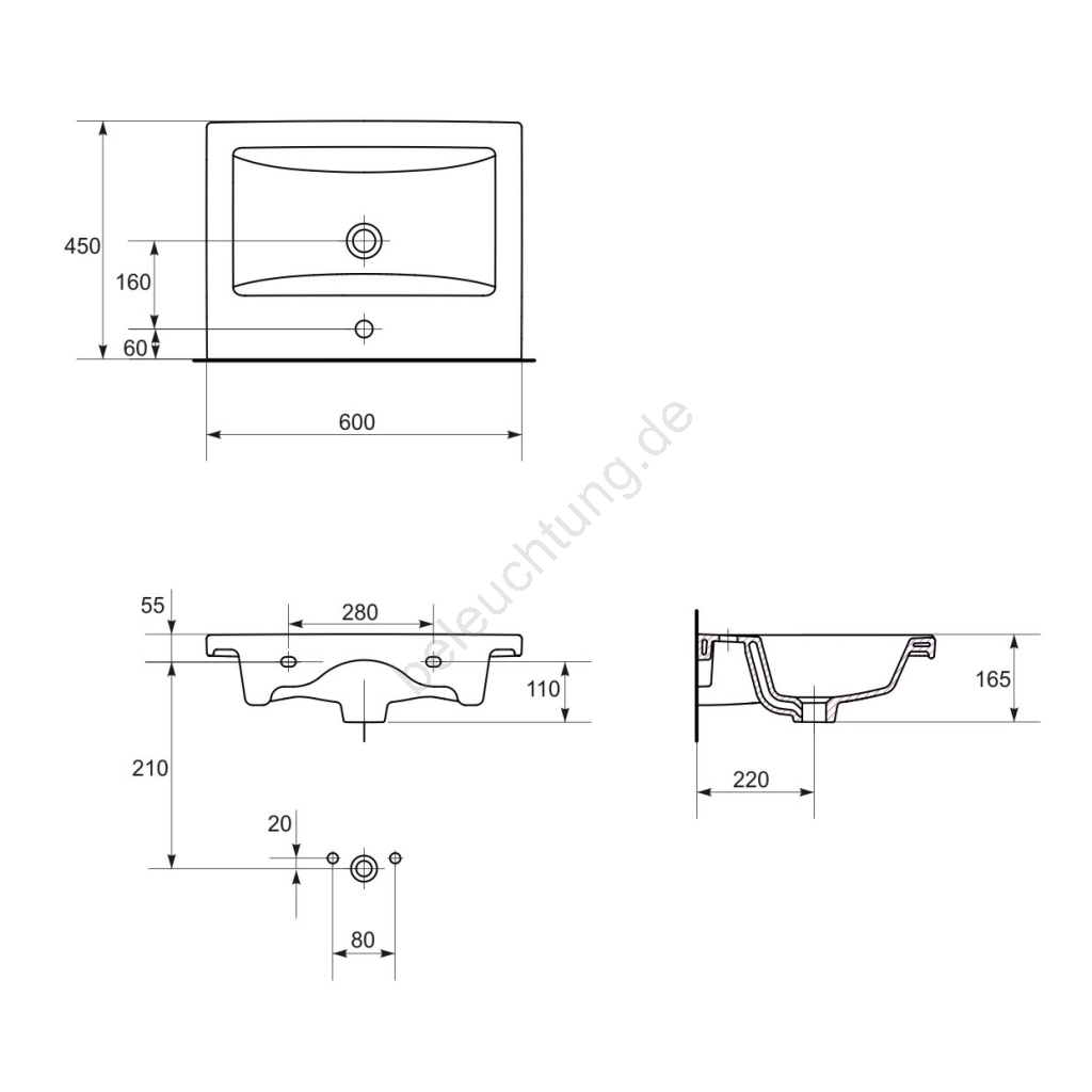 • Lieferumfang: Waschbecken ohne Siphon und Armatur.