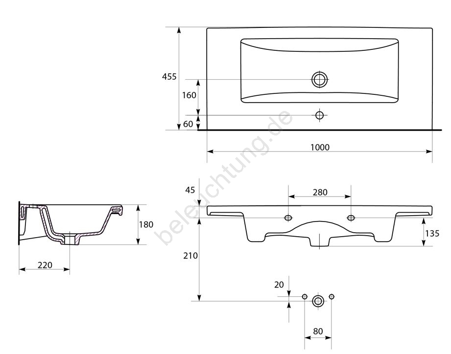 • Modernes und elegantes Waschbecken mit Überlauf und Armaturbohrung.