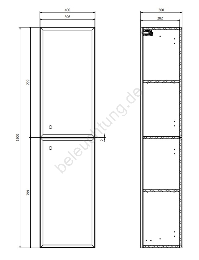• Türfront, Korpus und die drei inneren Einlegeböden des Schranks sind aus 16mm Spanplatte mit mattweißem Lack gefertigt.