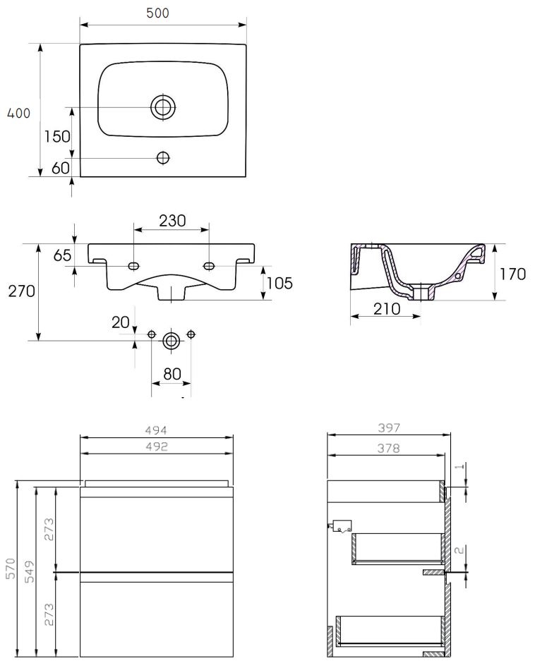 • Das Keramikwaschbecken hat eine klassische rechteckige Form mit Hahnloch und Überlauf.
