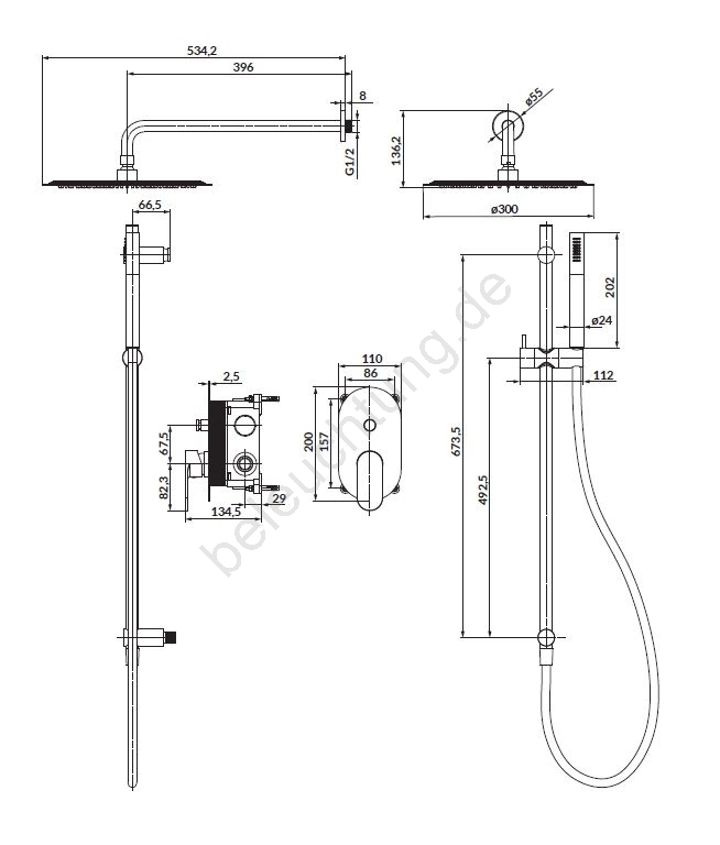 • eine Edelstahl-Duschkopf SLIM (0,2 cm) mit Regenduschfunktion und einem Durchmesser von 25 cm,