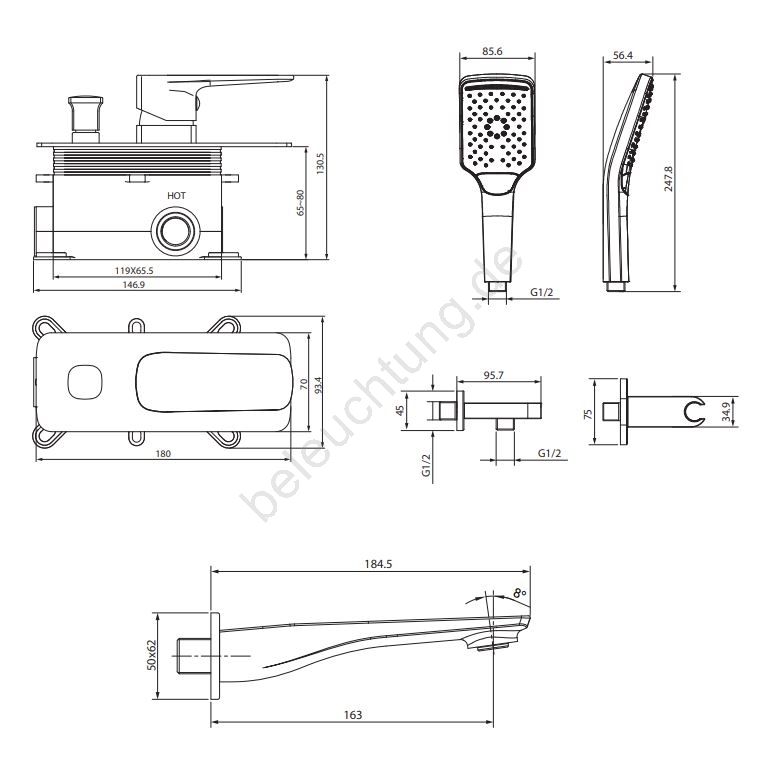 • einen Duschschlauch aus PVC mit einer Länge von 150 cm (WRAS-Zertifikat),