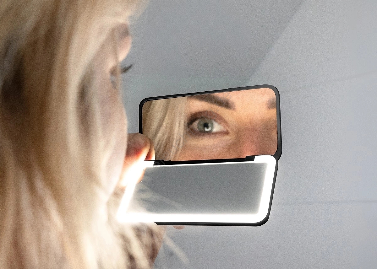 • Kompakter Kosmetik-Taschenspiegel mit LED-Beleuchtung.