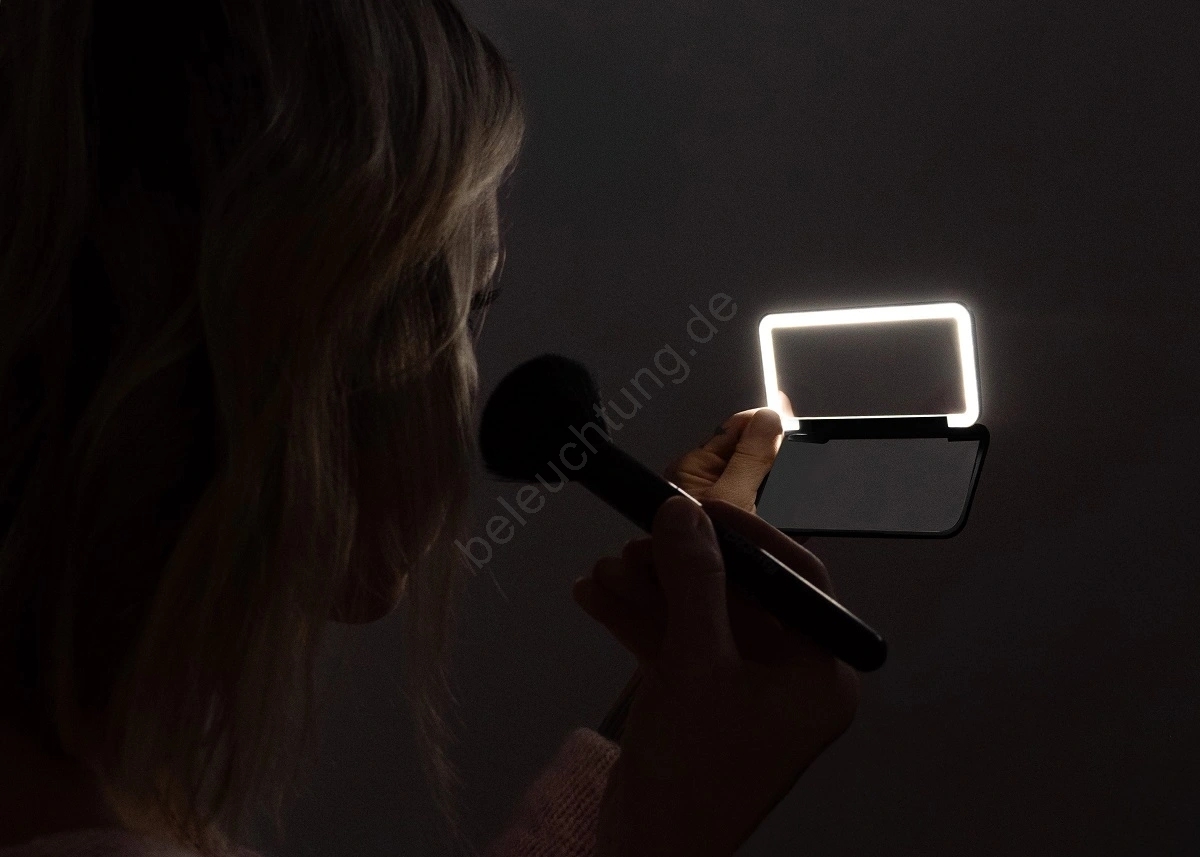 • Der Spiegel leuchtet bis zu 3 Stunden pro Ladung und lässt sich problemlos per USB-Kabel z. B. über eine Powerbank aufladen.