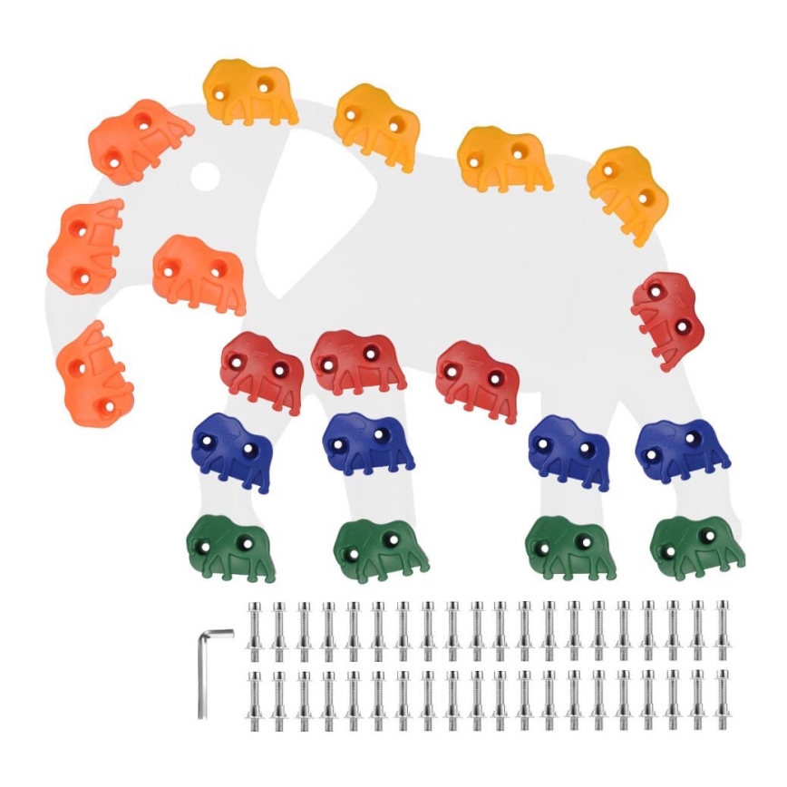 • Bunte, mit Elefantenmotiven verzierte Klettergriffe ergänzen jede Kinder-Kletterwand perfekt.