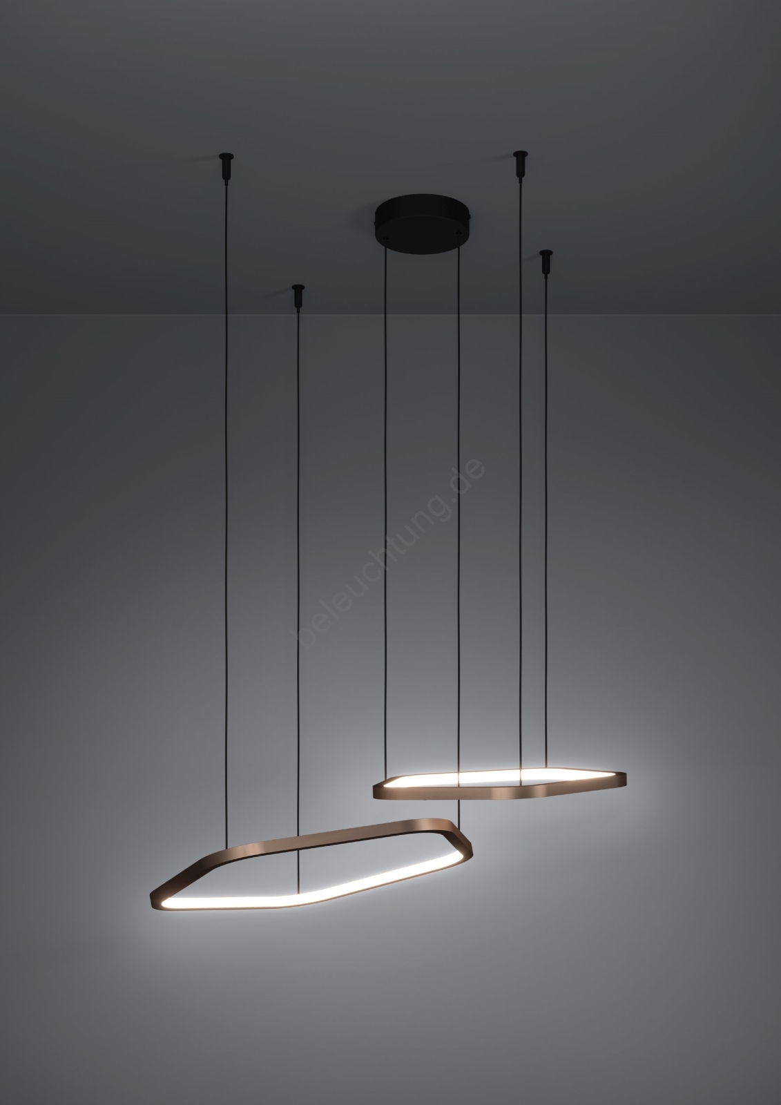 • Kombination aus messingfarbenen Lichtelementen und schwarzem Deckenbaldachin.