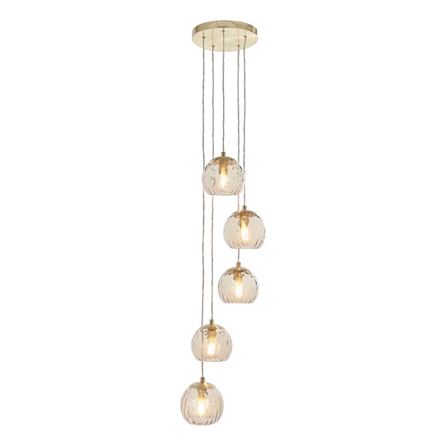 Endon 91972 - Pendelleuchte mit Kabelaufhängung DIMPLE 5xE14/7W/230V gold/rauchiges Beige zeichnet sich durch schönes und funktionales Design aus. Eine Glühbirne mit E14 Sockel ist für die Leuchte geeignet. Hier, können Sie andere Glühlampen zu vorteilhaften Preisen kaufen. Sie erhalten eine attraktive Ergänzung für Ihr Zuhause.