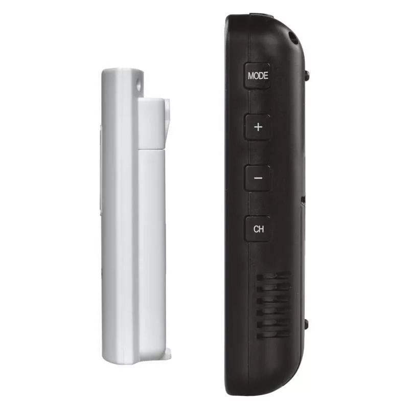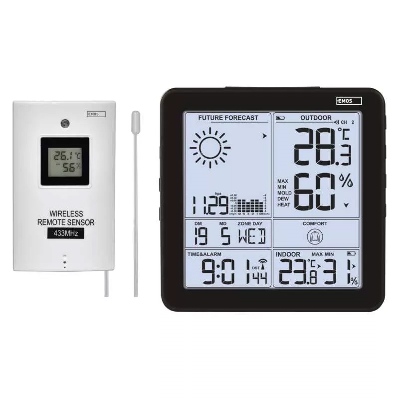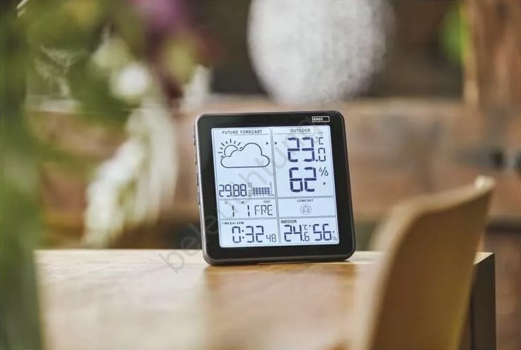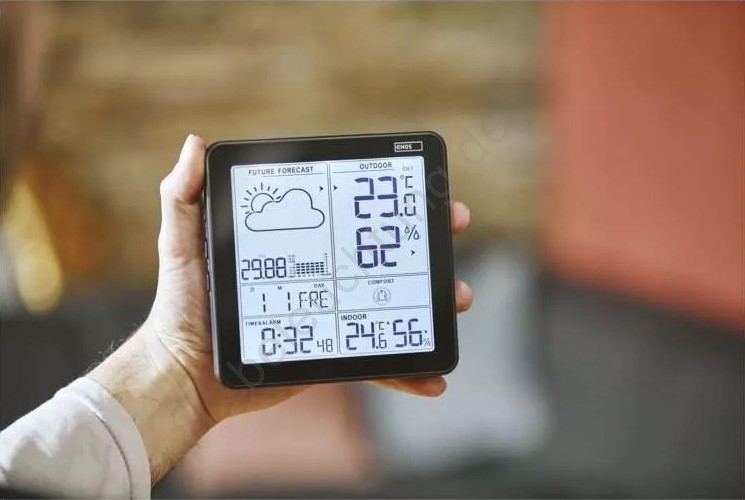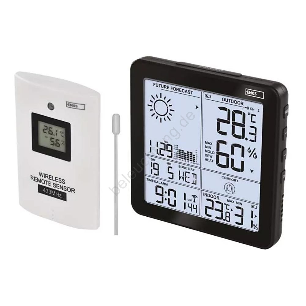 • Zeigt Informationen an: Innen- und Außentemperatur, Innen- und Außenluftfeuchtigkeit, minimale und maximale Temperaturwerte, Wettervorhersage, Uhrzeit, Datum und Kalender.