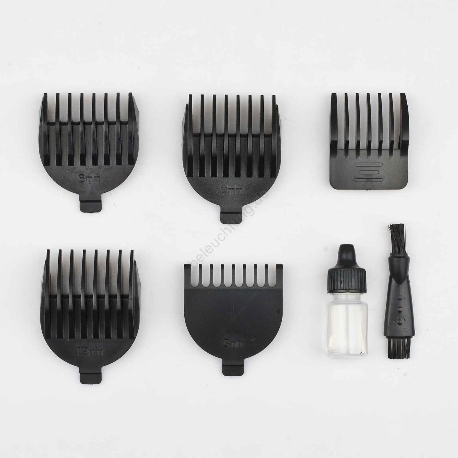 • Im Lieferumfang enthalten sind 4 Aufsteckkämme zum Haareschneiden, 1 Aufsteckkamm zum Barttrimmen, eine Reinigungsbürste und Schmieröl.