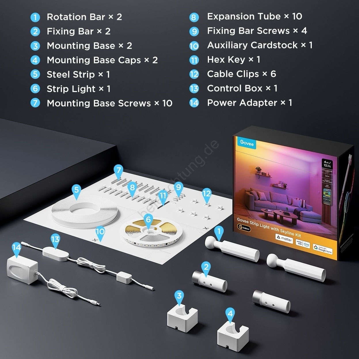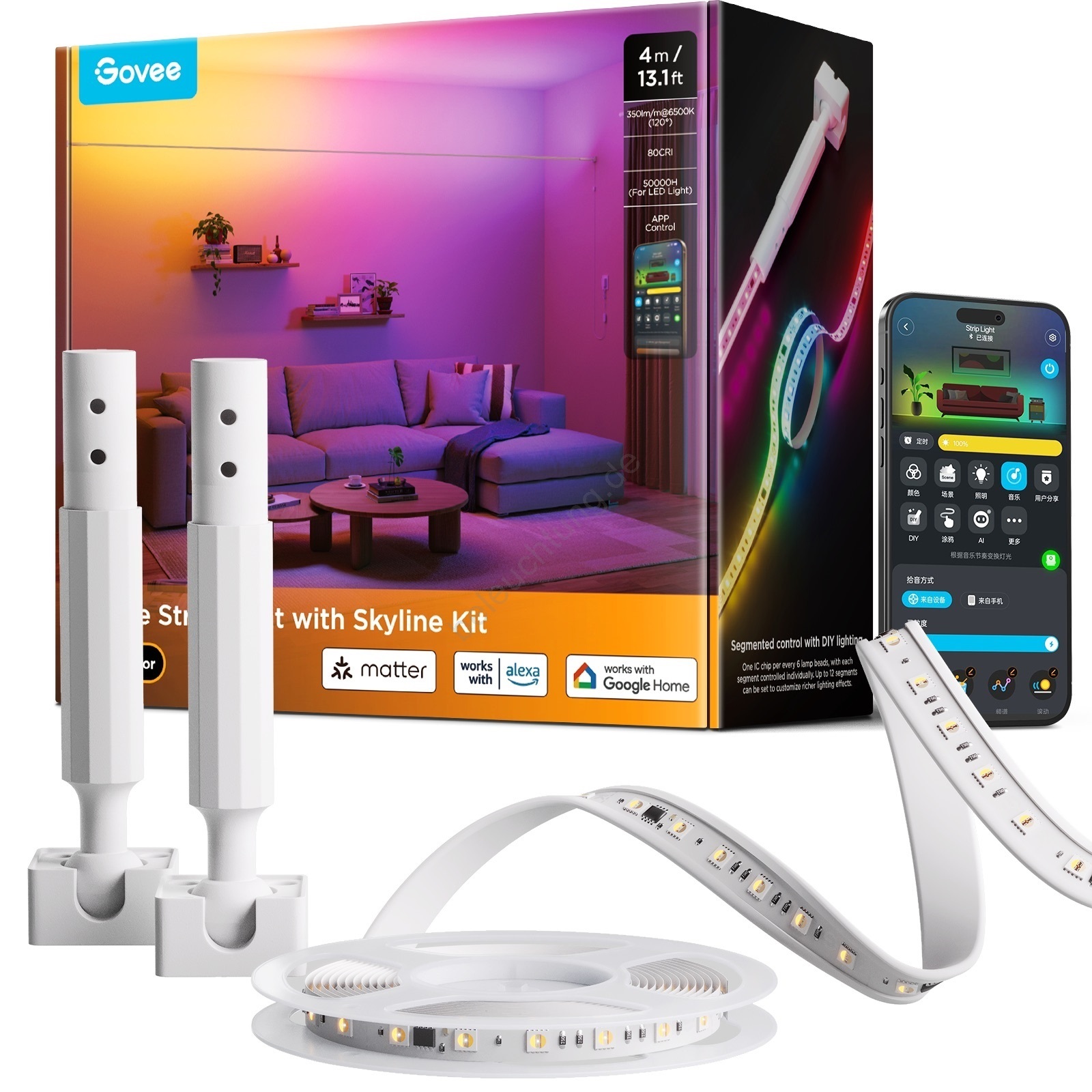 • Govee – RGBICWW hängender LED-Streifen, 36 W / 24 V, 4 m, Skyline Matter, WLAN