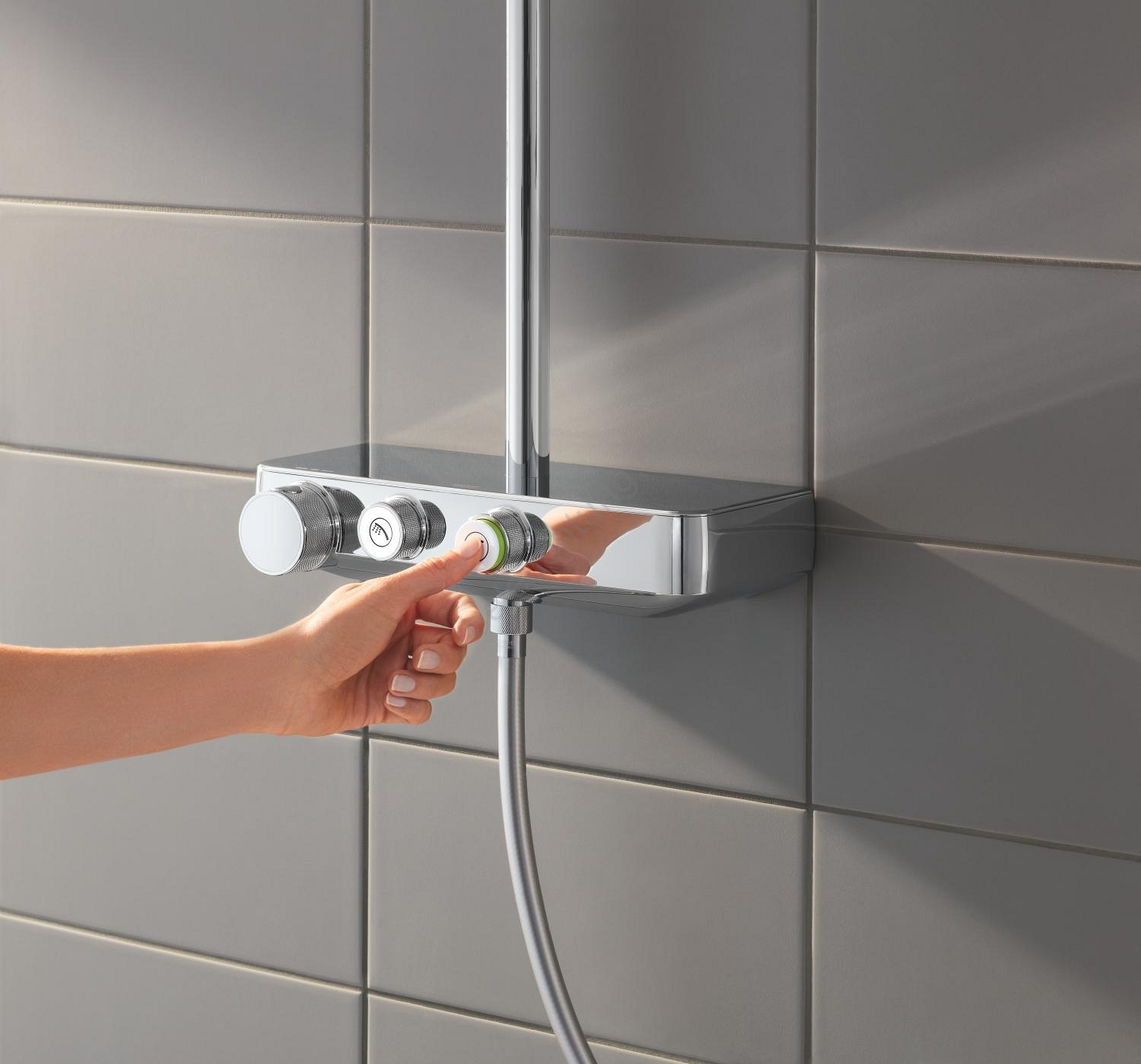 • Die innovative Technologie GROHE SmartControl ermöglicht einfaches Umschalten zwischen Kopf- und Handbrause sowie die präzise Einstellung der Wassermenge.