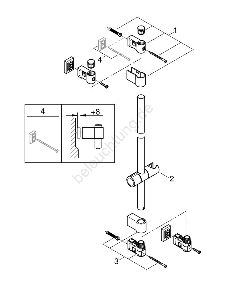 • Die einstellbare obere Halterung GROHE FastFixation ermöglicht die Montage in bestehenden Bohrungen.