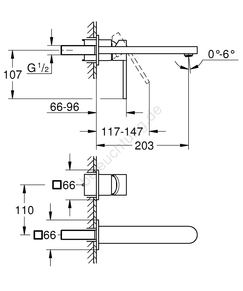 • Der Abstand zwischen Griffmitte und Auslauf beträgt 110 mm, die Auslauf­länge 203 mm.