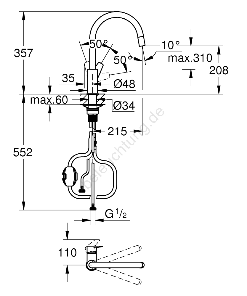 • Empfohlener Mindestwasserdruck 1,0 bar für optimale Leistung.