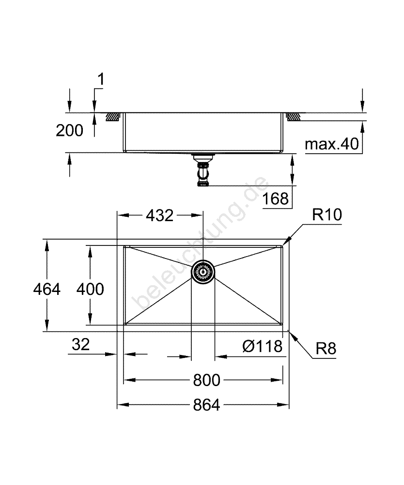 • Außenradius R11 (Unterbau) / R3 (Auflage), Innenradius der Mulde R10 für modernes Design.