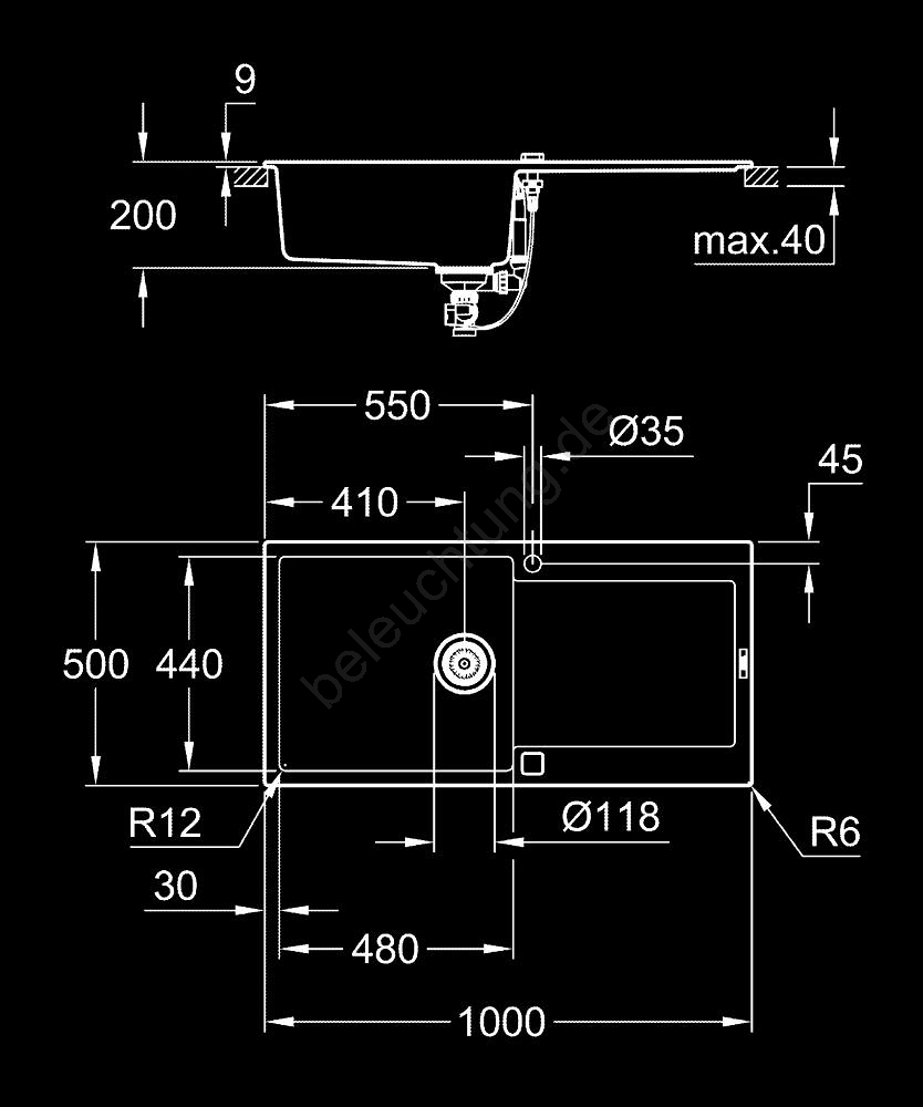 • Außenradius R6 und Innenradius des Beckens R12 für ein modernes Erscheinungsbild und einfache Reinigung.