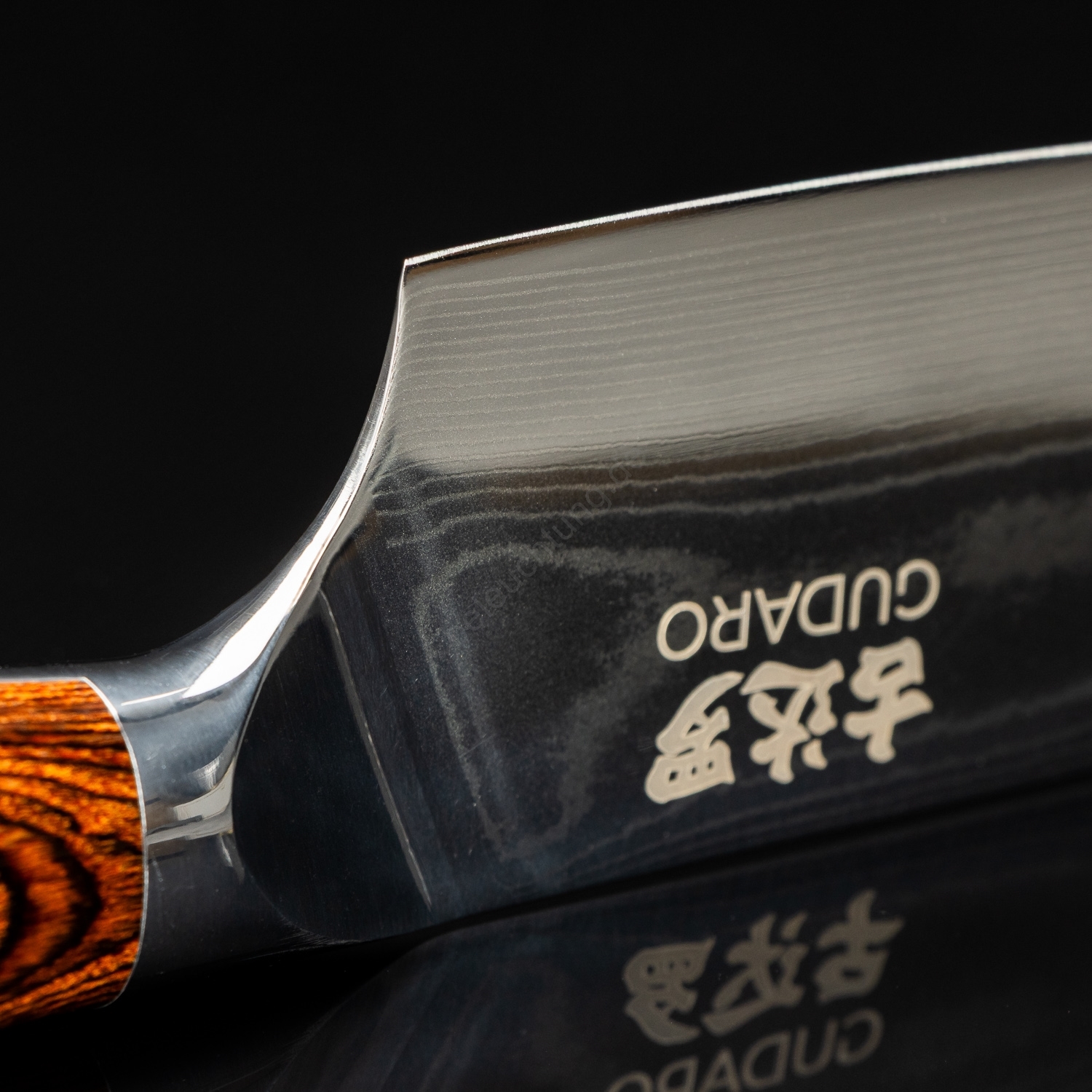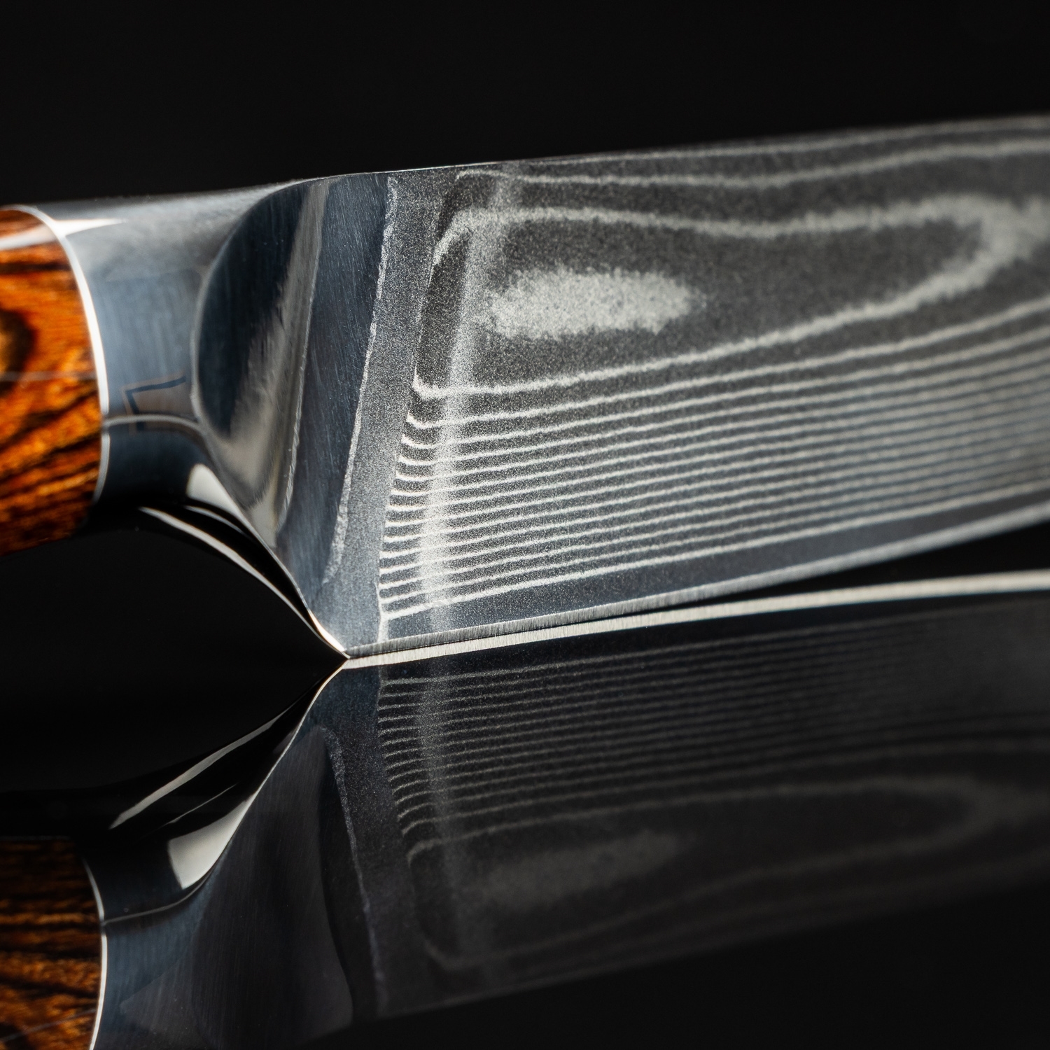 • Die Klinge mit einer Länge von 200 mm besteht aus 67 Lagen Damaststahl mit einem Kern aus VG10 – hochwertigem japanischem Stahl, bekannt für seine außergewöhnliche Härte, Strapazierfähigkeit und langanhaltende Schärfe.