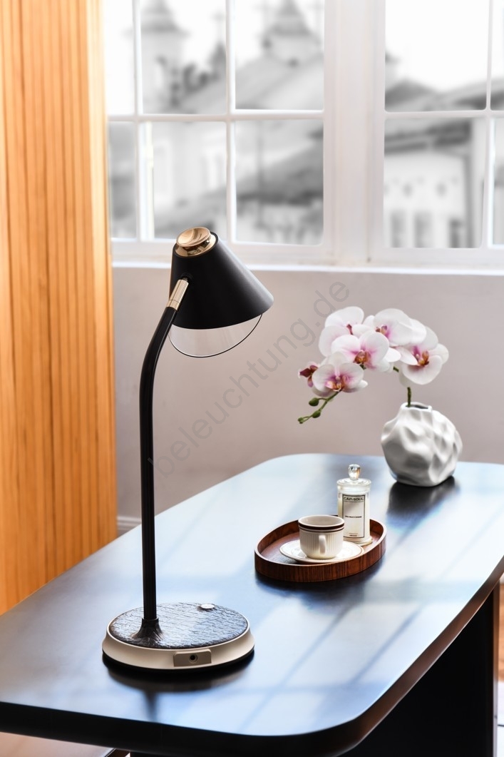 • Qi kabelloses Laden integriert in der Lampenbasis.