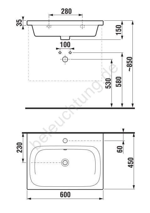 • Lieferumfang: Waschbecken ohne Siphon und Armatur.
