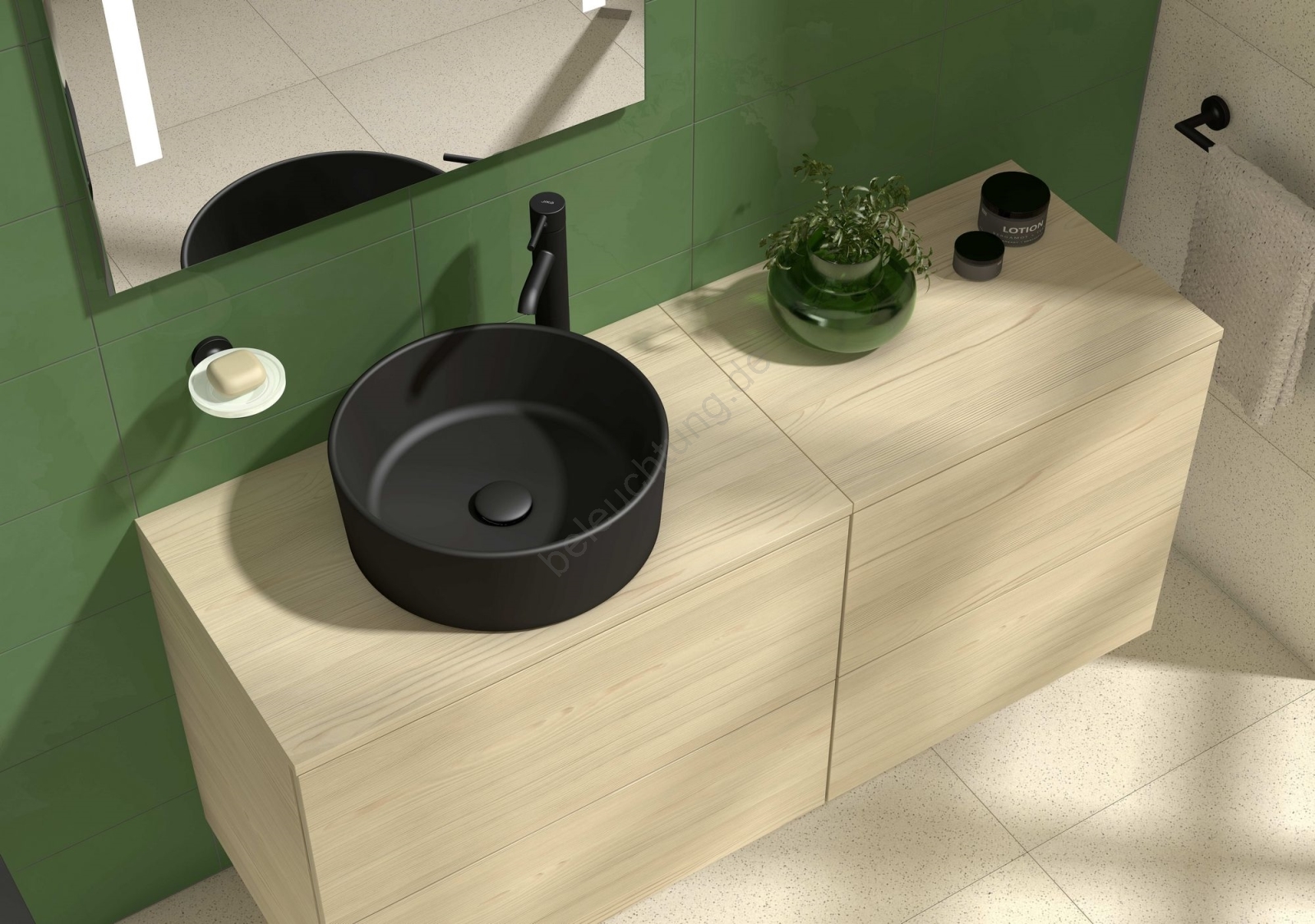 • Das Waschbecken ist zur Aufsatzmontage vorgesehen, was eine flexible Platzierung und Kombination mit verschiedenen Arten von Waschtischplatten ermöglicht.