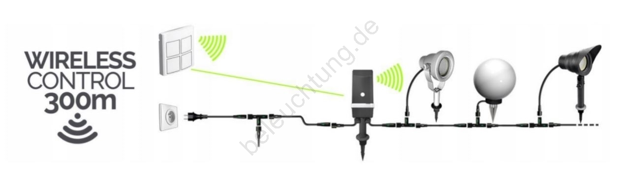 • Mit dem Schalter können Sie die Beleuchtung aus einer Entfernung von bis zu 300 Metern steuern.