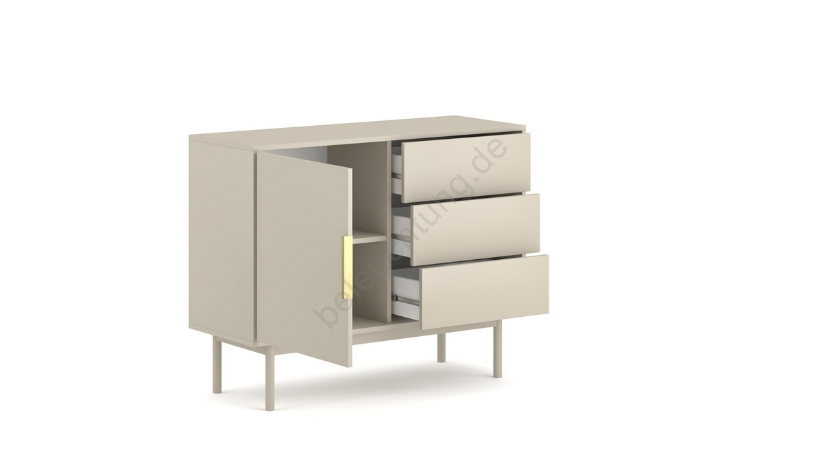 • Eine Tür auf der linken Seite und drei Schubladen auf der rechten Seite bieten übersichtlichen Stauraum.