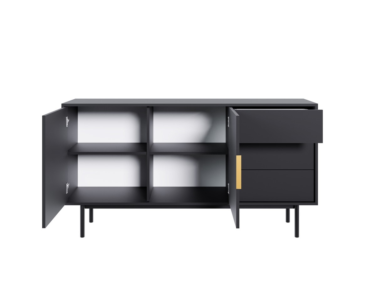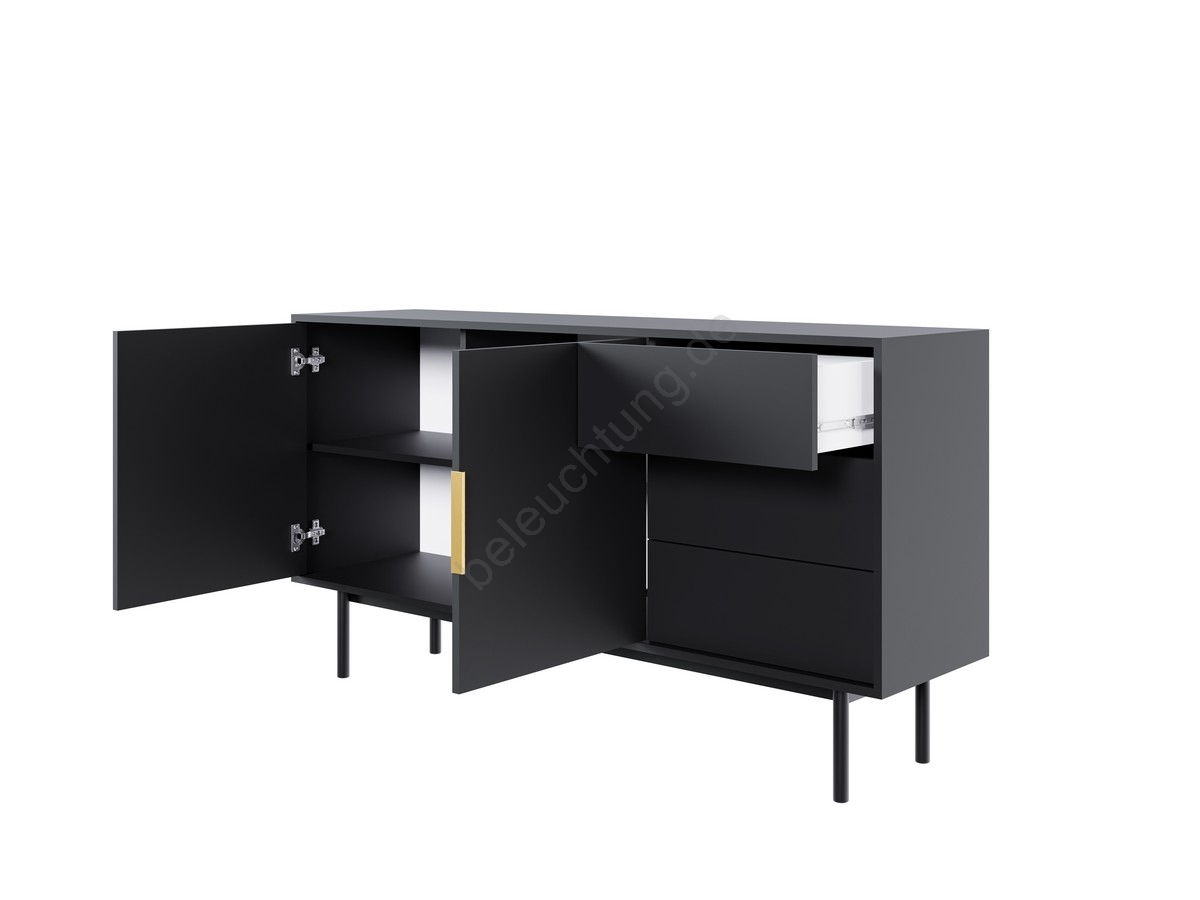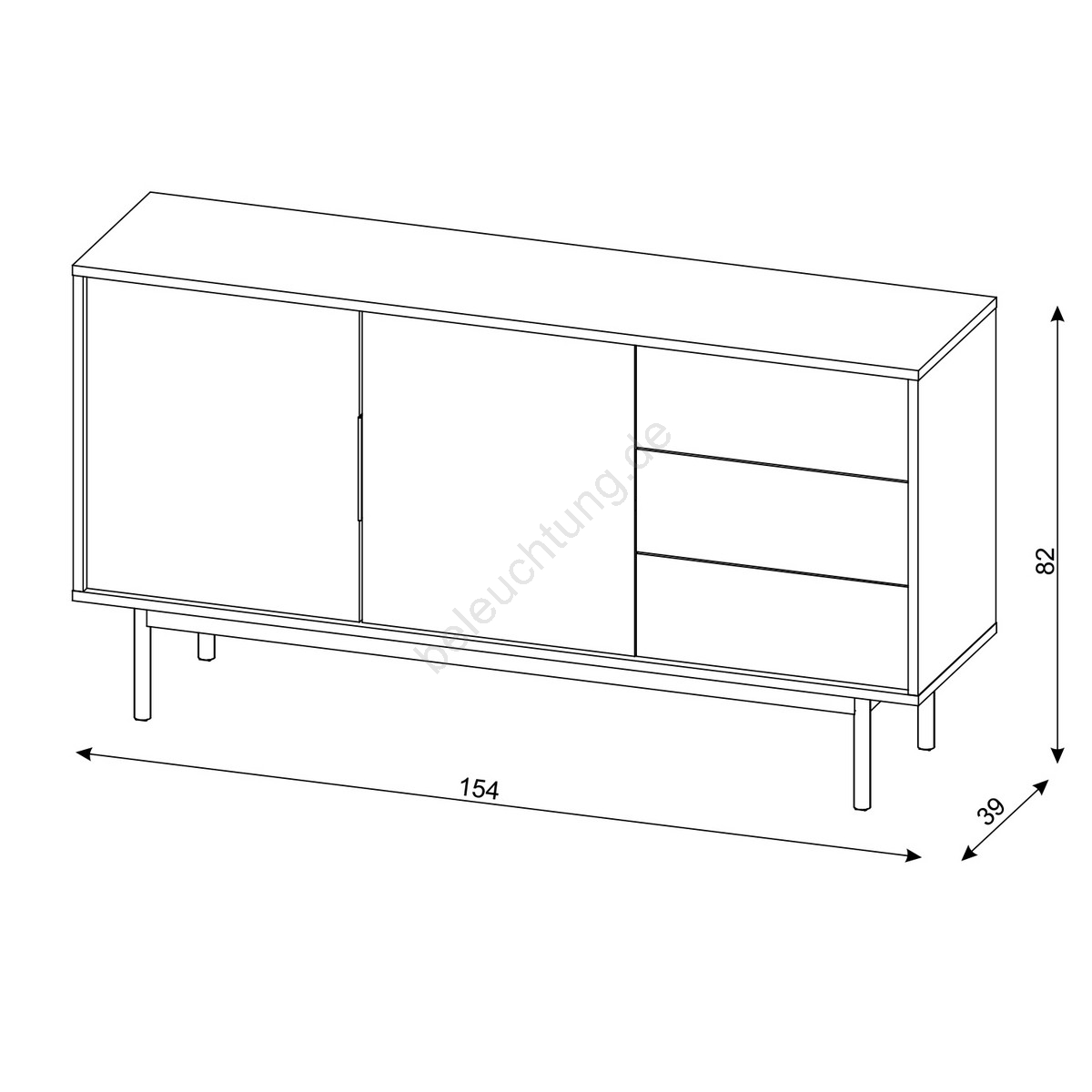 • Sie verfügt über zwei Türen links und drei Schubladen rechts, die eine übersichtliche Aufbewahrung ermöglichen.