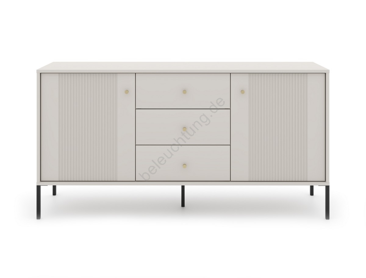 • Sie verfügt über drei mittig angeordnete Schubladen sowie zwei Fächer mit Türen und vertikaler Riffelung.