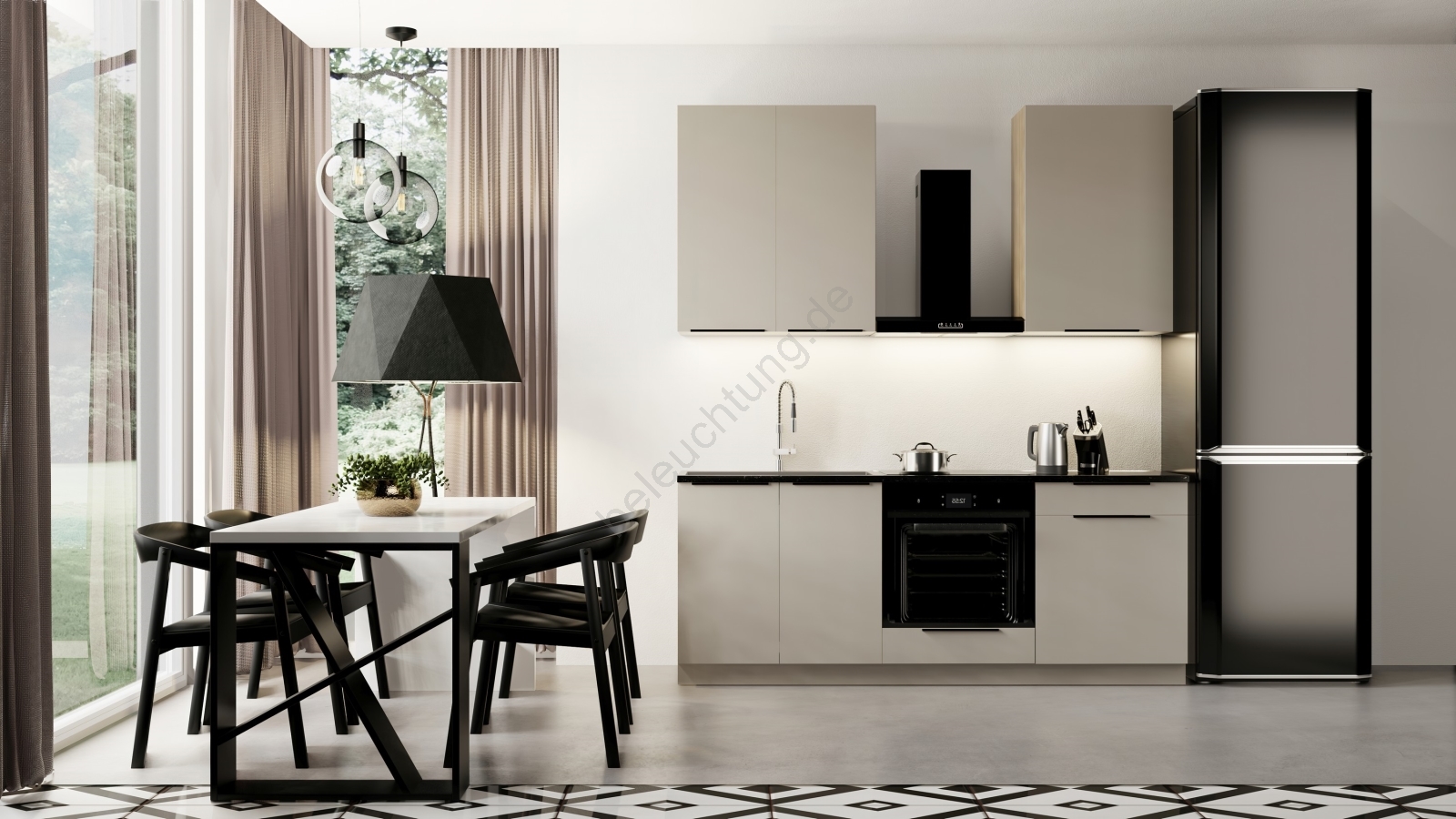 • Bringen Sie mit dieser Küchenzeile Charme und Eleganz in Ihr Zuhause, die auf klare Linien und ein zeitloses Erscheinungsbild setzt.