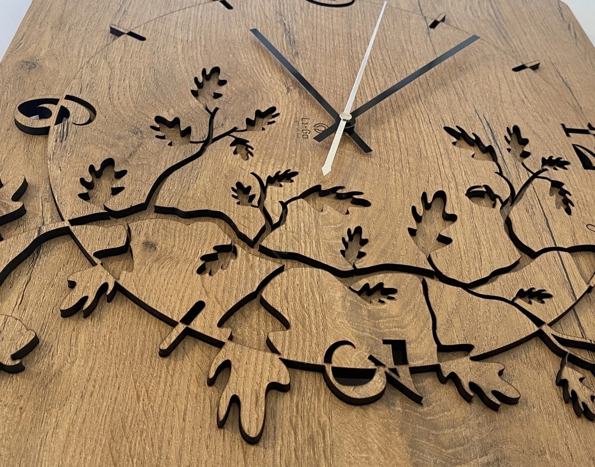 • Wanduhr aus Holz mit einem einzigartigen, handgeschnitzten Motiv.