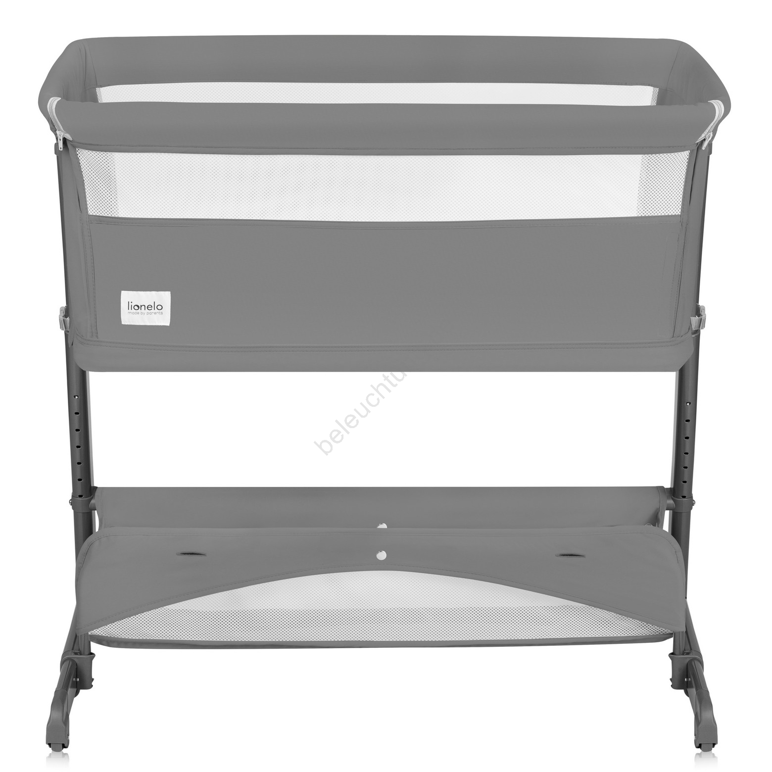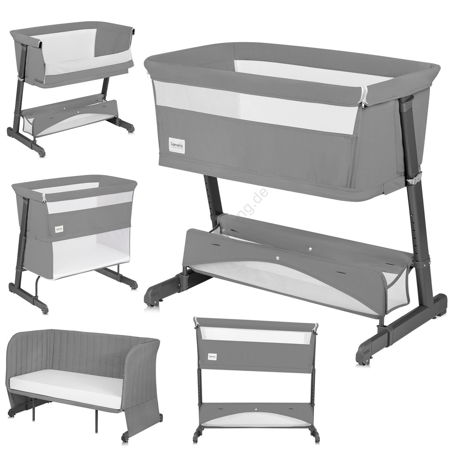 • Beistellbett mit abnehmbarem Seitenteil und verstellbaren Füßen zur Anpassung an die Betthöhe der Eltern.