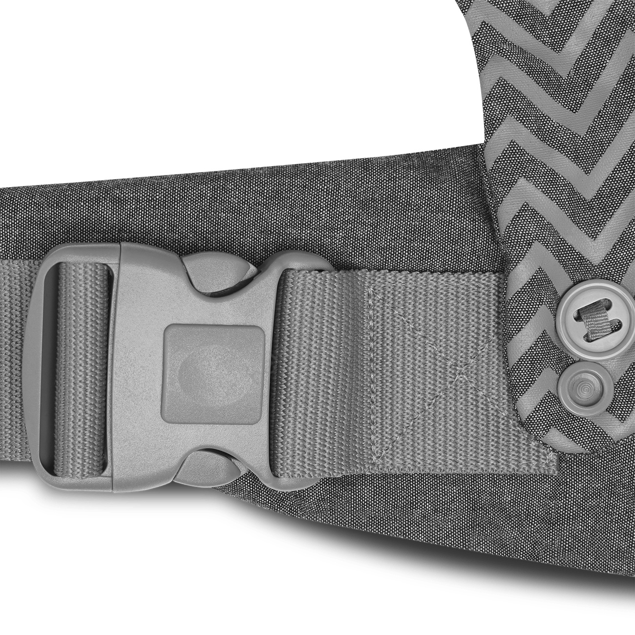 • Doppelte Sicherung des Hüftgurts, die die Stabilität der Position des Kindes gewährleistet.