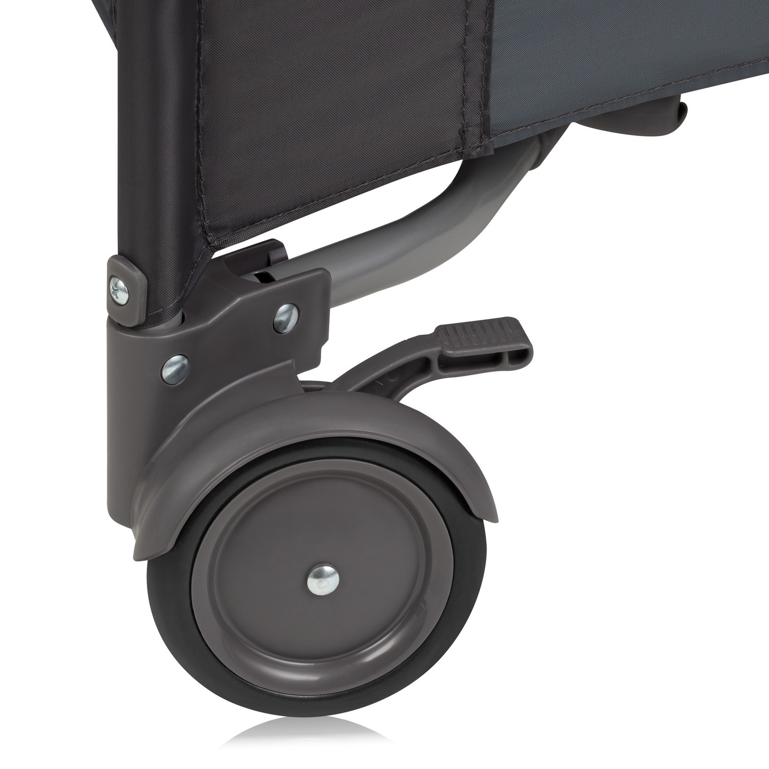 • Dank zweier Rollen mit Feststellbremse können Sie das Laufgitter nach Belieben versetzen.