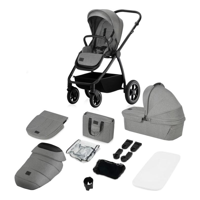 • Zubehörset: Fußsack, Moskitonetz, Bezug für den Babykorb, Regenverdeck, Elterntasche, Becherhalter, abschließbarer Korb.