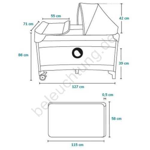 • Lieferumfang: Wickelaufsatz mit seitlichen Taschen (für Windeln, Puder etc.), Zubehörkorb mit zwei Fächern, großes Moskitonetz, Verdeck und Spielbügel mit Plüschspielzeug.