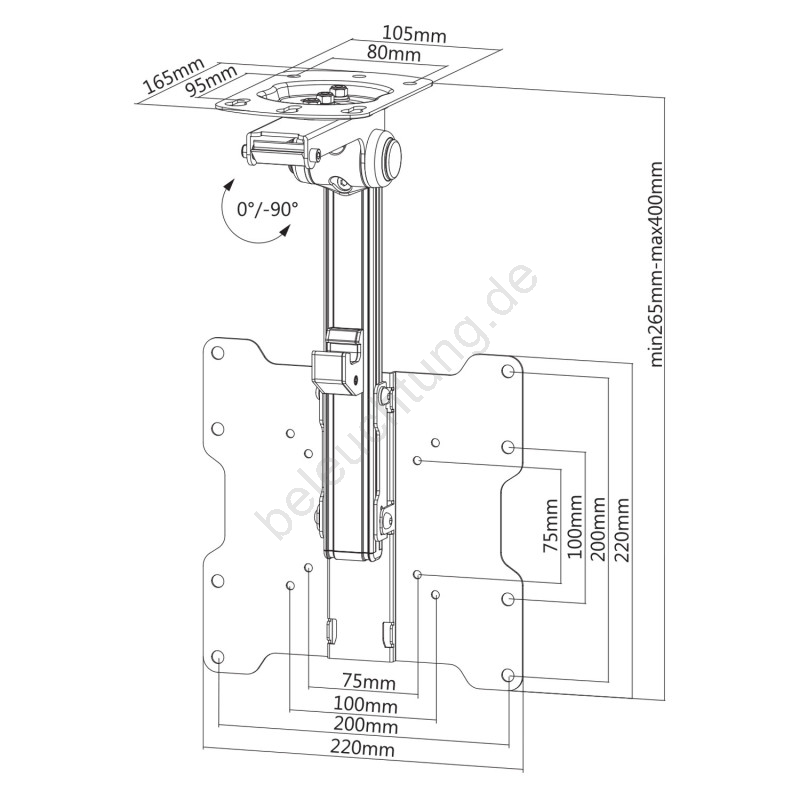 • Bietet eine verstellbare Höhe im Bereich 265–400 mm und eine Neigefunktion des Bildschirms von 0° bis -90°.
