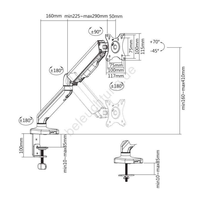 • Sie bietet 2 Möglichkeiten zur Befestigung an der Tischplatte: Montage am Tischrand (Plattenstärke 10 - 85 mm) oder Befestigung durch die Tischplatte an beliebiger Stelle.